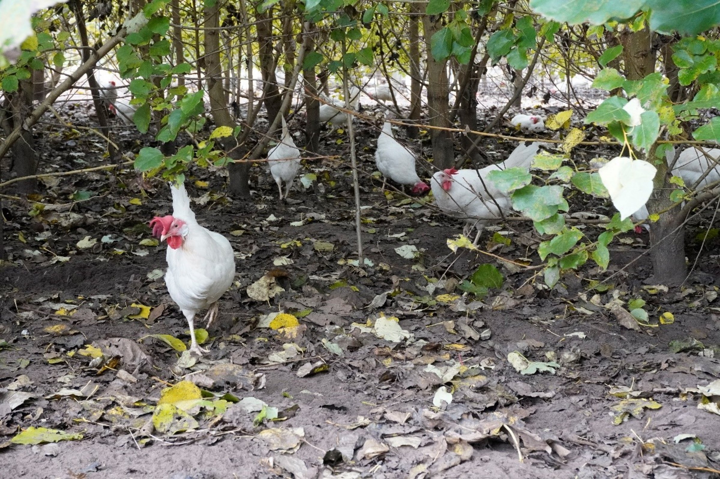 Außerdem ist zum Auslauf von Familie Engling zu sagen, dass jedem Huhn im Auslauf 5 m² statt der im Biobereich vorgeschriebenen 4 m2 zur Verfügung stehen. Somit hat der Betrieb noch etwas Puffer, sollten bestimmte Bereiche des Auslaufs kurzzeitig abgesperrt werden müssen. Durch dieses zusätzliche Platzangebot hat die längste Baumreihe eine Länge von ca. 190 m bis in die Ecken des Auslaufs hinein. Auch in diesem weiten Abstand zum Stall sind noch Hühner zu finden.