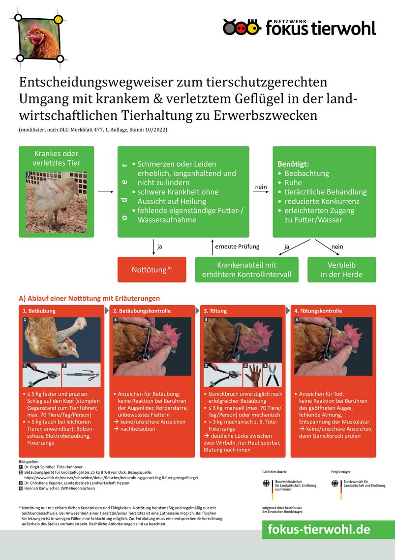 Das vorliegende Poster soll eine kompakte Entscheidungshilfe zum Thema Umgang mit krankem und verletztem Geflügel geben. Für die Haltung, sowie für die Durchführung des tierschutzgerechten Nottötens von Masthühnern ist in Deutschland ein Sachkundenachweis erforderlich.