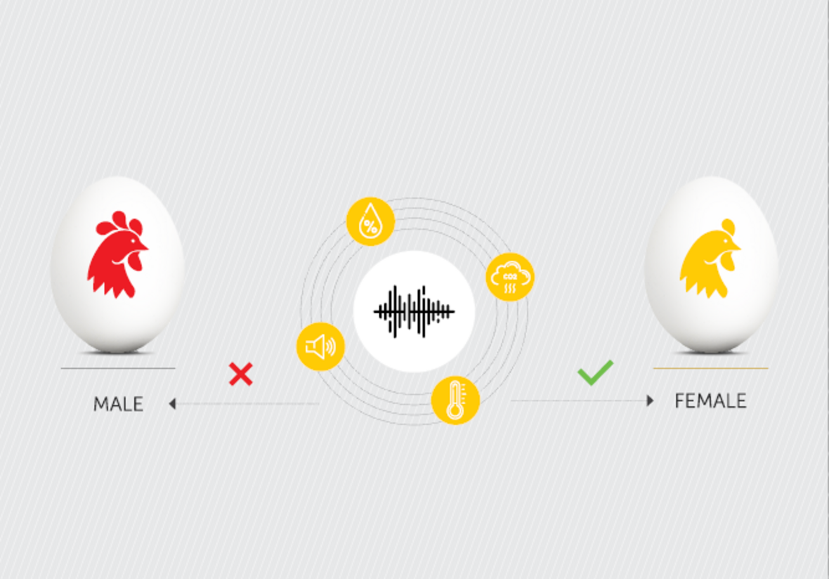 Ebenfalls vor der Bebrütung setzt die Methode einer weiteren israelischen Firma, SOOS21, an. Diese forscht an der Beeinflussung des Geschlechts von Hühnerembryonen vor der Festlegung der Geschlechtsmerkmale. Durch die Steuerung von Luftfeuchtigkeit/Temperatur und mit Hilfe von Schallwellen sollen sich einheitlich weibliche Embryonen entwickeln. Die Bruteier werden hierzu auf eine spezielle Eierpalette gelegt, auf der sich die Vibrationen der Schallwellen gleichmäßig zu jedem Ei bewegen. Mit Hilfe dieser Schallwellen wird die Expression von weiblichen Genen angeregt und genomisch männliche Embryonen entwickeln weibliche Geschlechtsmerkmale und damit verbunden die Fähigkeit Eier zu legen. Diese „Geschlechtsumkehr“ ist möglich, da bei Hühnern in der Embryonalentwicklung das Geschlecht erst nach dem 6. Entwicklungstag festgelegt wird22. Die Methode ist dabei nicht-invasiv und funktioniert ohne genetische Modifikationen oder hormonelle Interventionen.