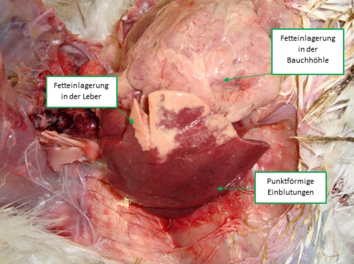 In der Sektion weisen betroffene Puten häufig eine gute Körperkondition auf. Die Tiere haben lediglich in der Bauchhöhle vermehrt Fett eingelagert (Abb. 3).1 Die Leber ist insgesamt vergrößert. Aufgrund von Einblutungen und weiteren Fetteinlagerungen sind an der Leber dunkle und helle Verfärbungen des Gewebes zu erkennen.2 Jedoch nicht nur in der Leber wird das Gewebe geschädigt. Gelegentlich sind auch auf dem Herzen stecknadelkopfartige Blutungen zu erkennen und der Herzbeutel enthält eine gelblich-klare Flüssigkeit.3 Auch an der Bauchspeicheldrüse können weißliche Nekrosen auftreten.4 Zudem gerinnt das beim Eröffnen des Tieres austretende Blut nicht.3, 5 Bei der Untersuchung des Magens zeigt sich häufig, dass die betroffenen Tiere vermehrt Einstreumaterial und Federn gefressen haben.3 Zudem werden nicht selten sowohl E. coli- als auch Clostridien im Rahmen der bakteriologischen Untersuchung nachgewiesen.3, 4 Jedoch gilt es zu beachten, dass ein Teil der Puten trotz klinischer Symptome keine ersichtlichen Veränderungen an der Leber aufweist. Bei diesen Tieren können bislang auch im Blut keine chemischen Abweichungen nachgewiesen werden.2
