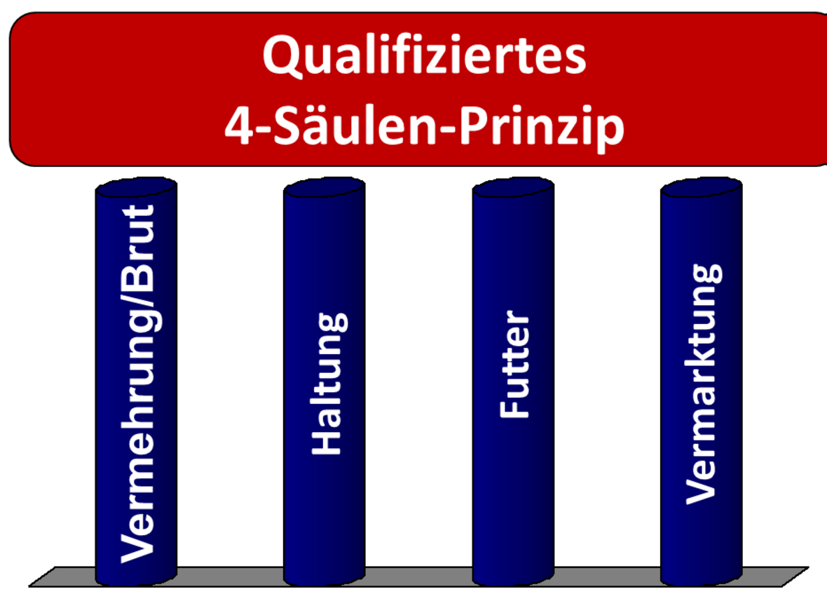 Kartzfehn ist keine Integration, sondern setzt auf ein 4-, bzw. 5-Säulenmodell (Abb. 1), bestehend aus unabhängigen Brütereien, Mastbetrieben, Futtermühlen, Vermarktung (Schlachterei) und Tierärzt:innen. Durch den Wettbewerb auf allen Stufen sind die Marktpartner stets bestrebt, die beste Qualität bzw. den besten Preis anzubieten. Diese Motivation kann in der Kette zu einer insgesamt bessern Wettbewerbsfähigkeit führen.