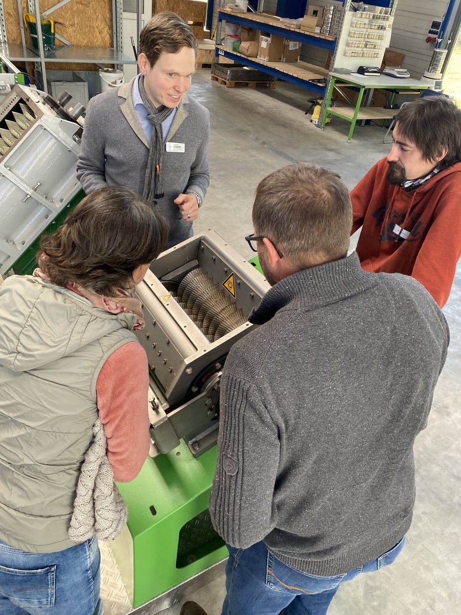 Bei MAKOBA in Rastatt erhielten die Teilnehmenden zunächst eine Unternehmensvorstellung, bevor sie den Multicracker® im betriebseigenen Technikum selbst testen konnten. Verschiedene Futtermittel wie Mais, Erbsen und Weizen wurden dort zerkleinert, wodurch sich interessante Unterschiede in der Aufbereitung zeigten. Diese praktischen Eindrücke boten reichlich Gesprächsstoff: Die Betriebsleiter:innen tauschten sich über ihre individuellen Lösungen und Erfahrungen in der Futterbereitstellung für die Legehennenhaltung aus.
