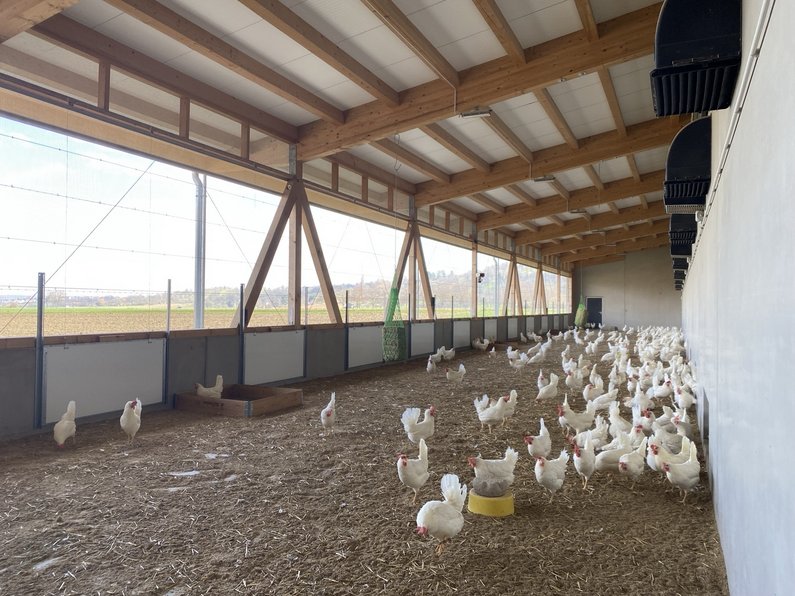 Anschließend versammelten sich alle Teilnehmenden im Seminarraum mit Blick in zwei Legehennenabteile. Bei Kaffee, Brezeln und Kuchen folgte eine verspätete, aber sehr persönliche Vorstellungsrunde, bevor die Betriebsleiter:innen erneut Zeit für intensiven Austausch hatten. Gerade dieser direkte Dialog wird von den Teilnehmenden als besonders wertvoll geschätzt, da er Kontakte ermöglicht, die sonst aufgrund räumlicher Distanz kaum zustande kämen..