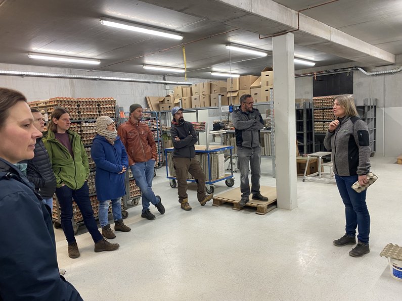 Am zweiten Tag hieß die Familie Munk die Gruppe auf dem Lauterhof in Owen willkommen. Melanie und Andres Munk stellten ihren Betrieb vor und erläuterten die Besonderheiten. Der 2011 gegründete Hof produziert und vermarktet Kartoffeln sowie Eier aus der eigenen Legehennenhaltung, deren Futter ebenfalls vor Ort erzeugt wird. Nach einem Rundgang durch die Sortier- und Verpackungsräume durfte die Gruppe auch einen Blick in den Stall werfen.