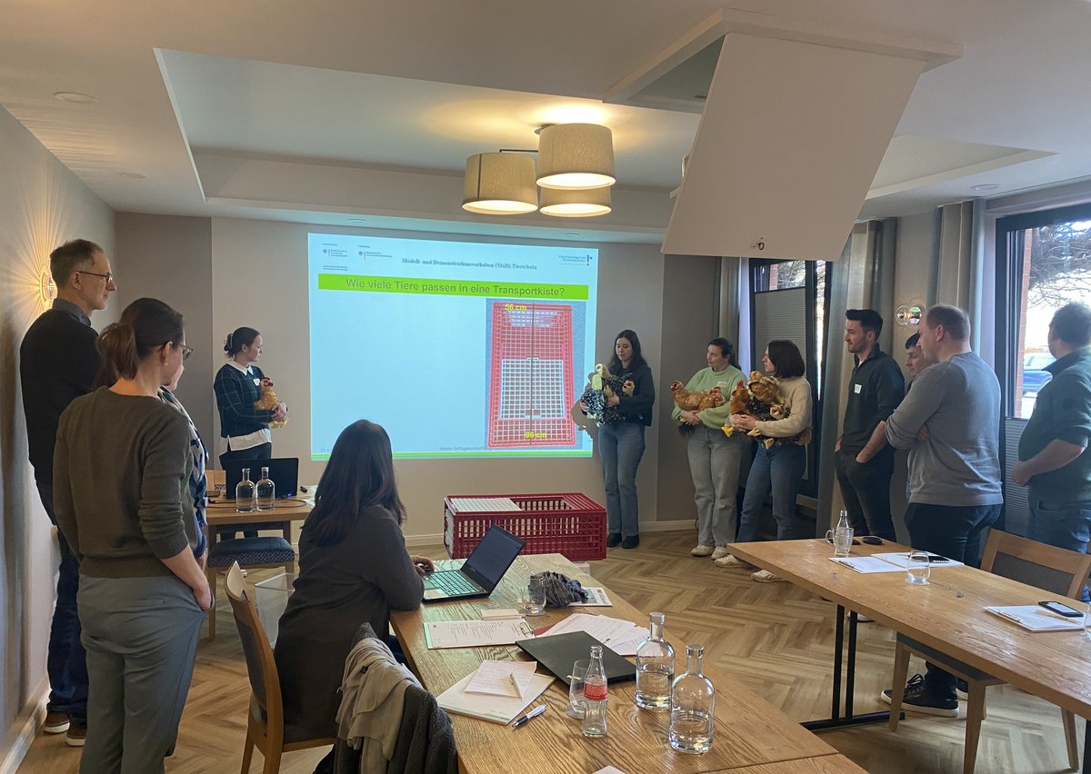 Als Einleitung in das Thema der mobilen Geflügelschlachtung stellte Rebecca Menten von der FH Soest das Projekt GeSchMo „Förderung des Tierwohls in der mobilen Geflügelschlachtung“ vor. GeSchMo ist ein MUD-Projekt und hat die Aufgabe praxisorientiertes Wissen aufzubereiten und an die Praxis weiterzugeben. Das Ziel des Projektes ist das Verfassen von Maßnahmen und Leitlinien für mehr Tierwohl in der mobilen Geflügelschlachtung. Das Projekt GeSchMo ist mit seiner Arbeit und den im Betrieb tätigen Praxisbetrieben vor allem im Westen und Süden Deutschlands ansässig. Jeder Betrieb wurde bei einer bestimmten Anzahl an Schlachtungen durch das Projekt begleitet und es wurden Daten aus unterschiedlichen Bereichen erhoben. Dazu gehören und anderem das Fangen der Tiere, der Wartebereich 1 und 2 wie auch die Kühlung und Lagerung der Schlachtkörper. Als praktische Einheit lud Frau Menten alle Teilnehmenden ein, mit ihr die gängigen Modelle von Transportkisten zu begutachten und auf Praxistauglichkeit zu testen. Beim kollegialen Austausch am Abend wurden die Themen der Betriebsleiter:innen wie auch das vorgestellte Projekt intensiv diskutiert.