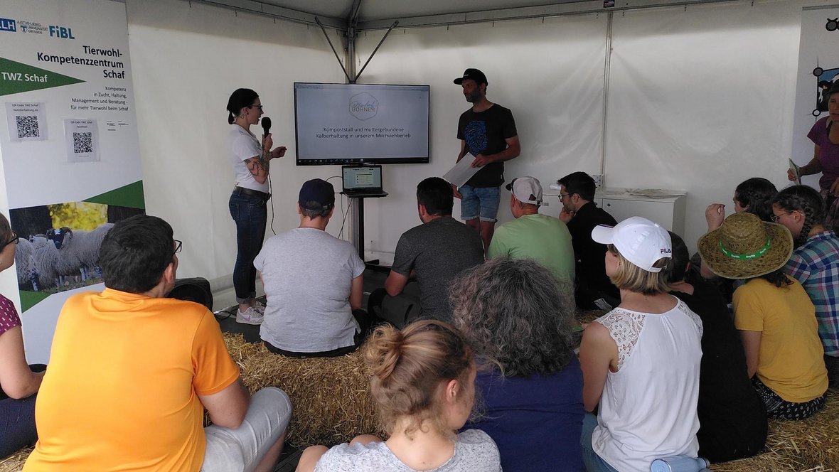Achim Ruf vom Bannsteinhof und Frauke Deerberg von der UniKassel eröffneten auf den Öko-Feldtagen 2023 die Impulslounge am Stand des Netzwerk Fokus Tierwohl mit den Themen der Mobilstallhaltung und Direktvermarktung sowie der Nährstoffeinträge im Legehennenauslauf. Im Anschluss stellten Klaus Bohner und Kathrin Goebel ihre Umsetzung der kuhgebundenen Kälberaufzucht vor. Auch die Vermarktung der männlichen Kälber wurde thematisiert. Welche Herausforderungen in der Öko-Schweinehaltung aufkommen präsentierten Wilhelm Schulte-Remmert und Paul Bird. Die Stärkung des eigenen Öko-Profils wie auch die hofeigene Verarbeitung des Fleisches waren Thema der Vorträge.