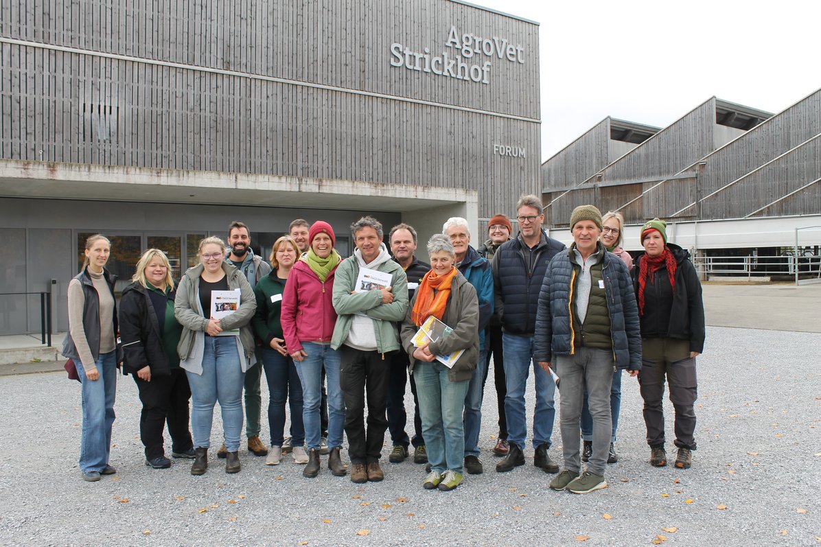Am 15. Oktober war die Gruppe vormittags auf dem AgroVet Strickhof in Lindau- einem großen Ausbildungs- und Forschungsbetrieb, der in die Agrarwissenschaftliche und Veterinärmedizinische universitäre Bildung der ETH Zürich und der Universität Zürich eingebunden ist zu Gast. Matthias Schick, Bereichsleitung im Bereich Tierhaltung und Milchwirtschaft, stellte den Betrieb vor und führte über das Gelände, wo eine Mitarbeiterin intensive Einblicke in das Management in der Kälberhaltung gab. Die Besichtigung der 2017 fertiggestellten Versuchsställe - mit Fokus auf das Thema Emissionsminderung und als Höhepunkt die sogenannten „Klimakammern“, in denen die Treibhausgasemissionen von Rindern gemessen werden – hinterließen einen bleibenden Eindruck bei allen Mitreisenden, was sich noch in den regen Diskussionen beim gemeinsamen Mittagessen zeigte...