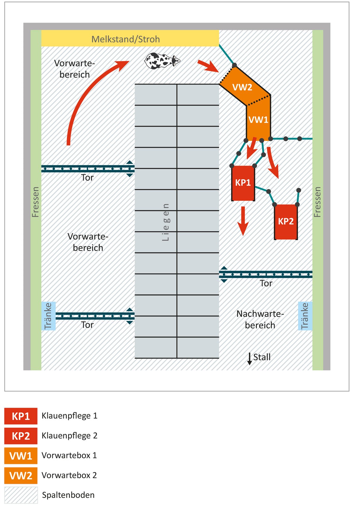 Den Betrachtungen liegt beispielhaft ein Betrieb mit 120 melkenden Kühen zugrunde. Dabei führen folgende Entscheidungen zu unterschiedlichen Konzepten für die Organisation und Integration der Klauenpflege: