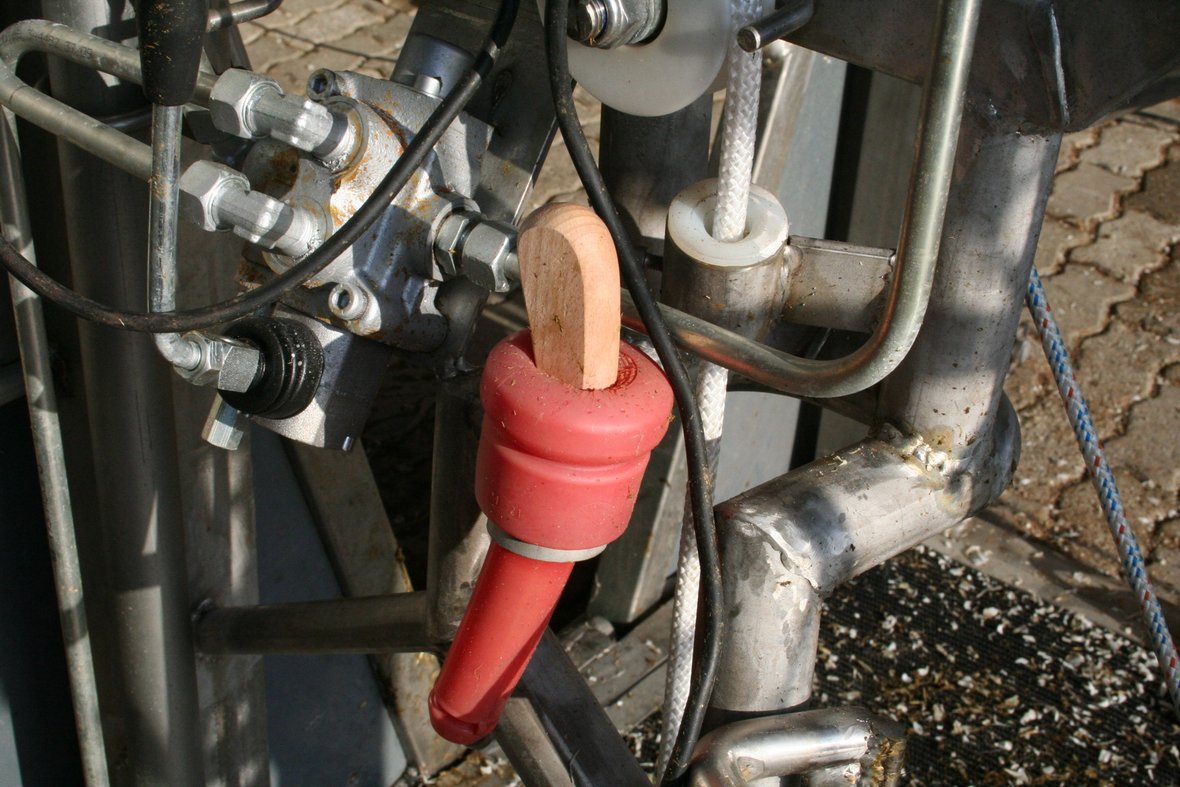 Bei Messern, Klauenscheren und Zangen muss darauf geachtet werden, dass diese genügend geschärft sind, um klare, glatte und saubere Schnitte ohne viel Krafteinsatz führen zu können. Beim Schneiden mit dem Klauenmesser sollte immer in Richtung der eigenen Hand gearbeitet werden. Aufgrund dessen gibt es eine links- und rechtsschneidende Ausführung im Handel, die im Wechsel genutzt werden. Um Verletzungen vorzubeugen und die Schnitthaltigkeit zu bewahren, können die Klauenmesser in den Arbeitspausen sicher z. B. in Ledertaschen oder Zitzengummis aufbewahrt werden (Abb. 7). Letztere lassen sich, um eine Übertragung von Krankheitserregern zu vermeiden, leichter reinigen und desinfizieren. Auch Klauenscheren und Zangen bedürfen einer richtigen Verwahrung bei Nichtbenutzung. Sie werden am Stand liegend oder hängend aufbewahrt und gehören nicht auf den Boden.