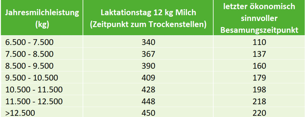 Somit kann Kühen mit höheren Laktationsleistungen eine freiwillige Wartezeit von mehr als 100 Tagen gewährt werden. In Tabelle 1 wird der letztmögliche Besamungszeitpunkt abhängig vom Laktationstag und der Jahresmilchleistung (kg) veranschaulicht.