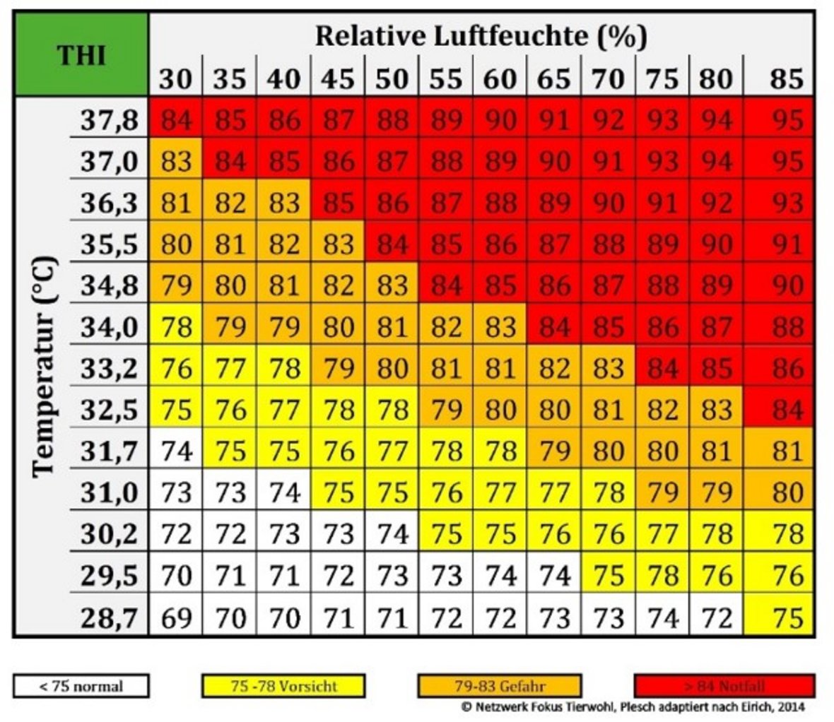 Ob die Gefahr von Hitzestress grundsätzlich besteht, kann mit dem Temperatur-Humiditäts-Index (THI) beurteilt werden.