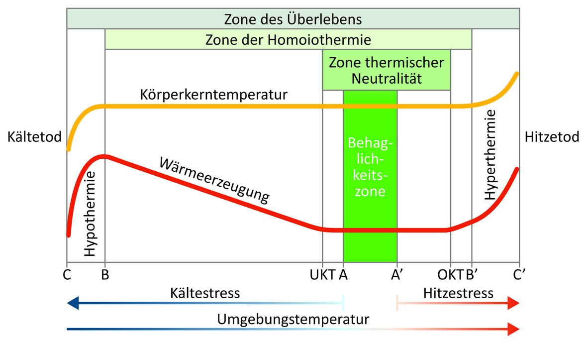 Bei Unter- oder Überschreiten der Grenzen B und B´ können die Tiere ihre Körpertemperatur nicht mehr im physiologischen Rahmen halten und es besteht Lebensgefahr (Sporkmann et al., 2016).