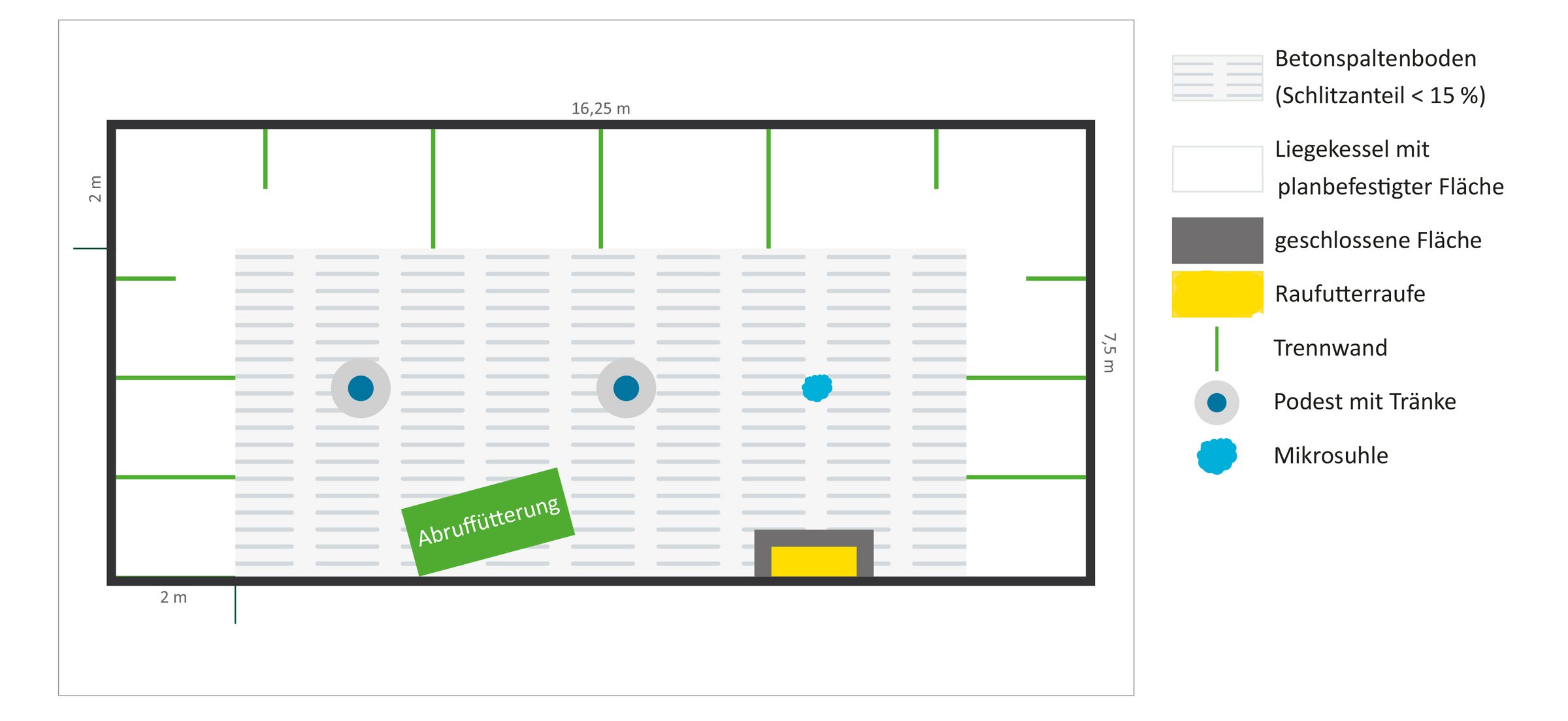 Durch die Abrufstationen und die damit einhergehende größere Gruppengröße lassen sich die Buchten einfacher strukturieren. Wichtig ist, Abrufstationen nicht als Sackgasse zu bauen. Dies kann am Eingang zu Gedränge und Kämpfen führen. Ideal ist es, die Tiere auf der anderen Seite aus der Station laufen zu lassen.