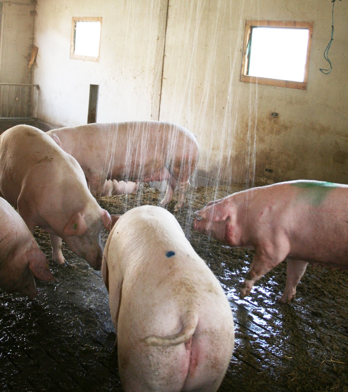 Das Wärmebedürfnis bei Sauen und Mastschweinen darf nicht 1:1 übertragen werden, da Sauen durch das erhöhte Platzangebot mehr Raum erwärmen müssen und durch eine geringere Futteraufnahme weniger Wärme bilden als Mastschweine. Aus diesem Grund müssen ihnen z. B. auch wärmegedämmte Liegebereiche zur Verfügung stehen. Dies lässt sich z. B. anhand des Raumvolumens bei 3 m Deckenhöhe darstellen: 2,25 m² je Sau = 6,75 m³ Raumvolumen je Sau vs. 0,75 m² je Mastschwein = 2,25 m³ Raumvolumen.1 Der Liegebereich sollte für die Sauen klimatisch vom Rest der Bucht abgetrennt werden. Er kann gedämmt oder mit viel Stroh ausgelegt sein.1