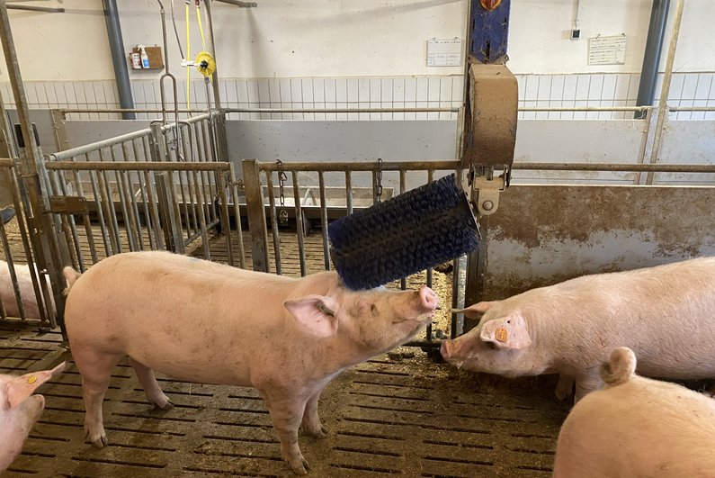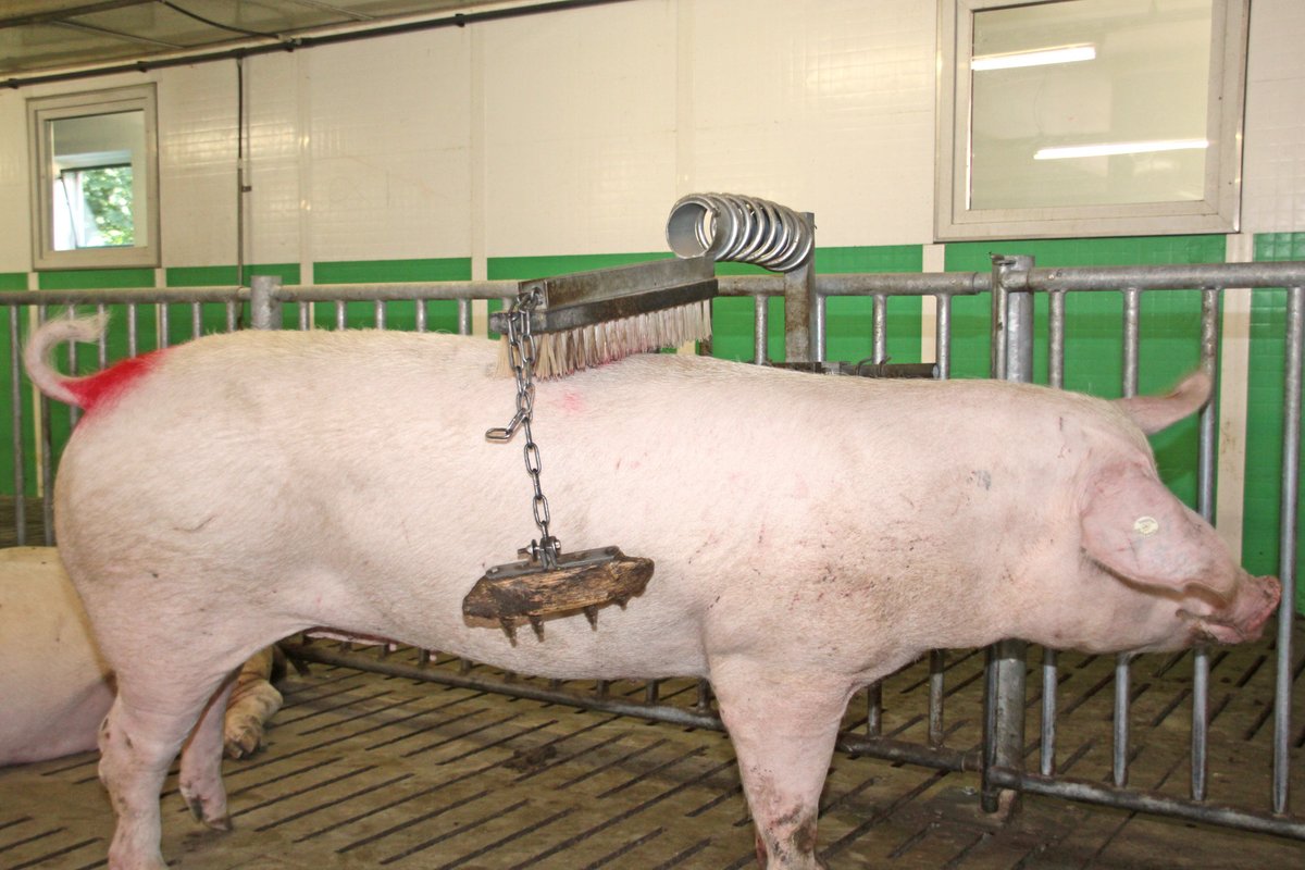Als weitere Beschäftigungsmöglichkeiten eignen sich mit Materialien gefüllte Wühltürme (Abb. 17) oder auch Pelletautomaten. Letztere bieten sich vor allem in Spaltenbodenställen gut an. Zusätzlich können weitere verschiedene Beschäftigungsmaterialien dazu dienen, zufriedene Sauen im Stall zu haben. Dazu zählen zusätzlich zum Raufutter z. B. eingestreute Bereiche, Seile oder auch Bürsten (Abb. 18). Um ein schnelles Anfressen der Bürsten zu vermeiden, können Bürsten aus dem Rinderbereich genutzt werden, die sich automatisch drehen (Abb. 19). Zum Scheuern können Malbäume verwendet werden (z. B. Holzstämme) oder auch Scheuermöglichkeiten aus Edelstahl. Letztere sind hochpreisiger, aber dafür gut zu reinigen.