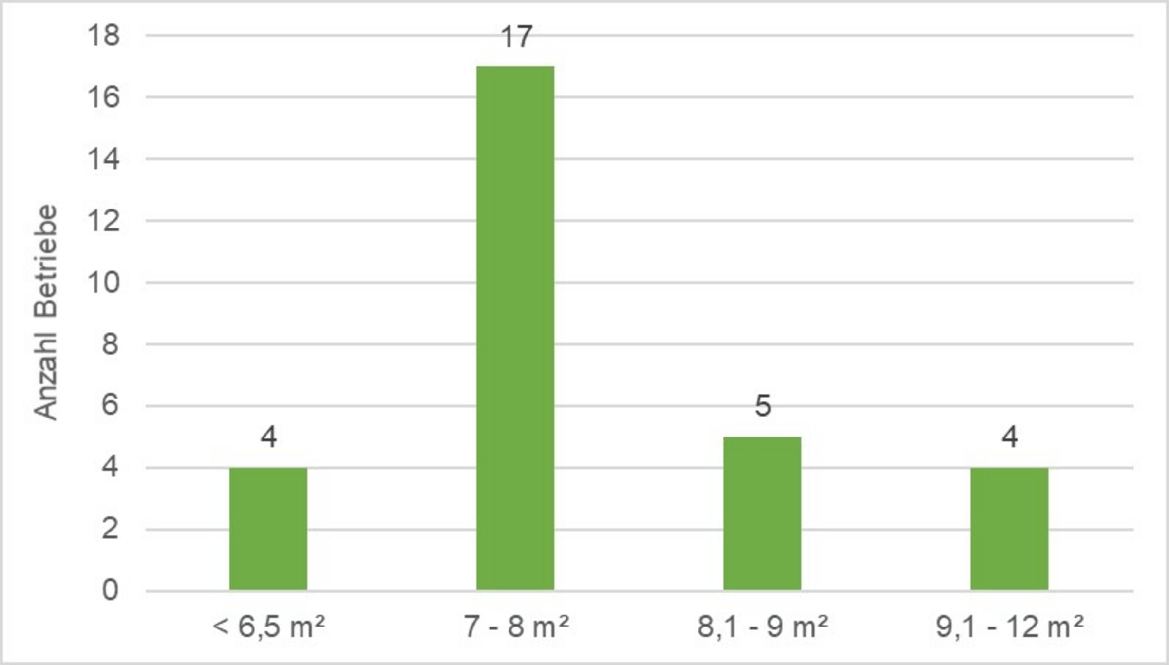 Auch für Buchten zur freien Abferkelung gilt ab 2036 eine Mindestfläche von 6,5 m², wenn der Betrieb konventionell wirtschaftet. Für ökologisch wirtschaftende Betriebe gilt wie bisher eine Mindestfläche von 7,5 m2 im Innenbereich. Von 30 Sauenhaltern gaben nur vier an, dass die Größe ihrer Freilaufbuchten kleiner als 6,5 m² ist. Der überwiegende Teil der Umfrageteilnehmenden hält die frei abferkelnden Sauen in Buchten mit 7 bis 8 m². In einigen Betrieben sind sogar Buchten installiert, die mit bis zu 12 m² deutlich mehr Fläche als die gängigen Bewegungsbuchten aufweisen (Abb. 3).