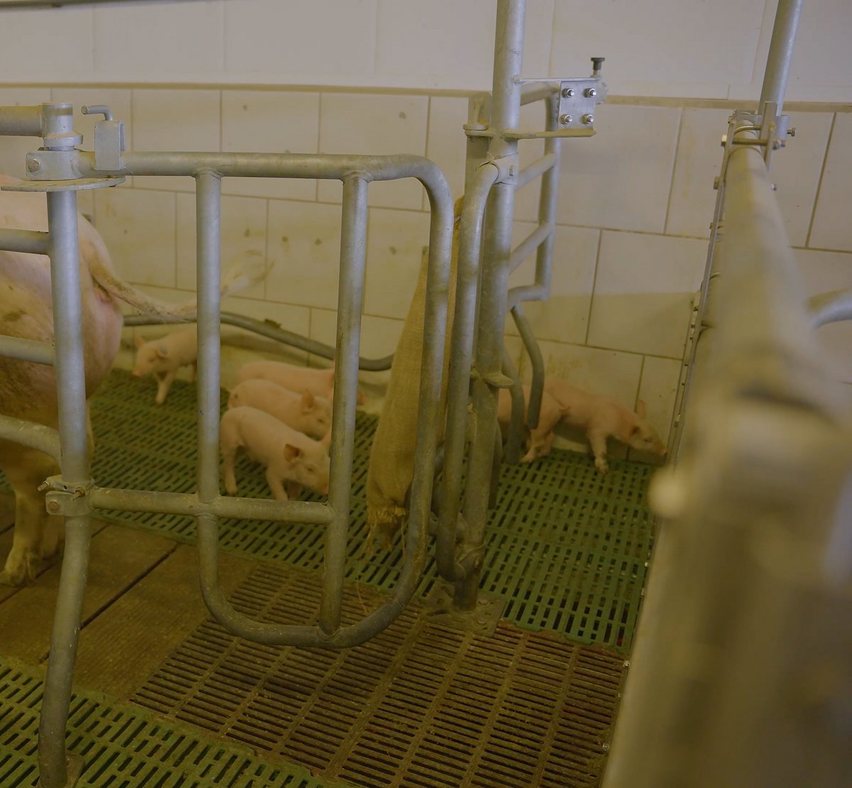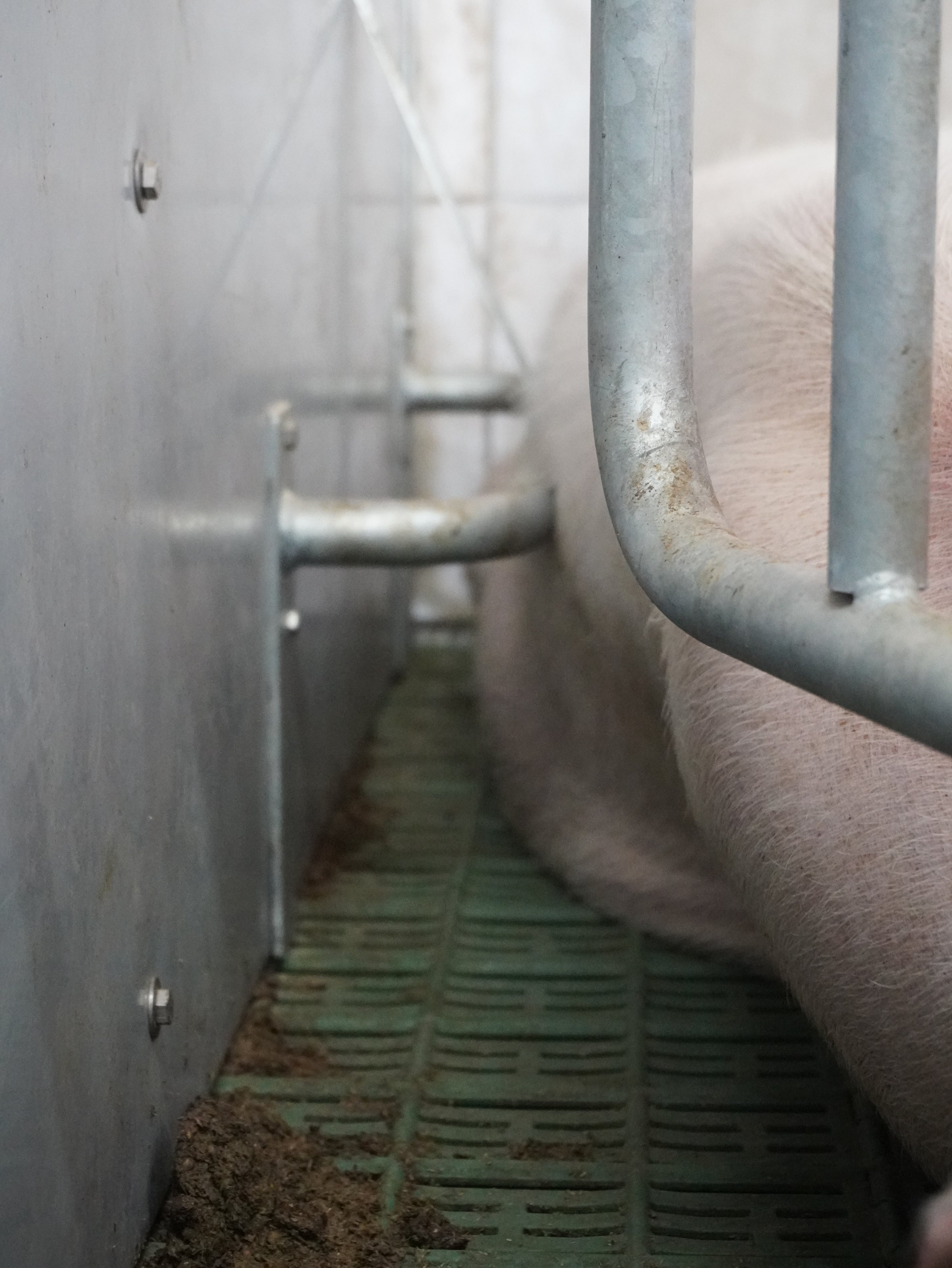 An den Buchtenwänden in Bodennähe angebrachte Metallrohre dienen weniger als Abliegehilfe, sondern eher als Abweisbügel (Abb. 34 und 35). Sie steuern das Liegeverhalten der Sauen indem sie das Liegen an der entsprechenden Wand unbequem machen. 28 Beim Abliegen an einem Rohr entsteht eine sehr hohe Punktbelastung an der entsprechenden Stelle bei der Sau. Das kann mitunter sogar zu Blutergüssen führen. Die Funktion als Schutzvorrichtung für Ferkel erfüllen sie ebenso wie Schrägbretter.