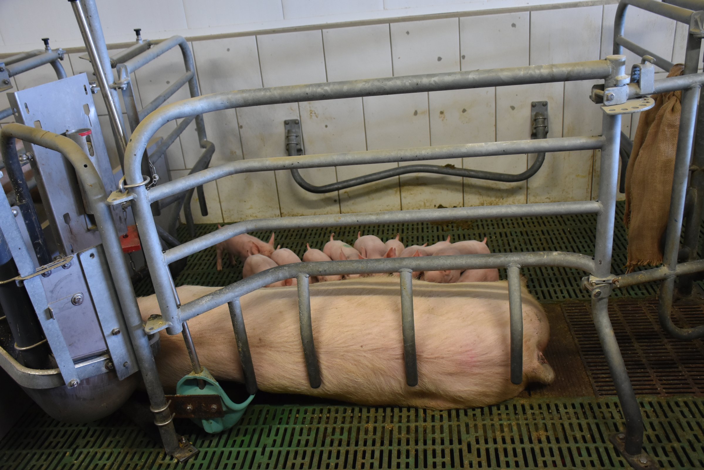 Es hat sich bewährt, den Aktionsbereich der Sau möglichst durch den Ferkelschutzkorb einzurahmen (Abb. 36). Dieser kann Abliegevorgänge unterstützen10 und ermöglicht es dann – arbeitswirtschaftlich und auch hinsichtlich des Tierverhaltens – auf günstige niedrige Buchtentrennwände (50 bis 60 cm) zu gehen.