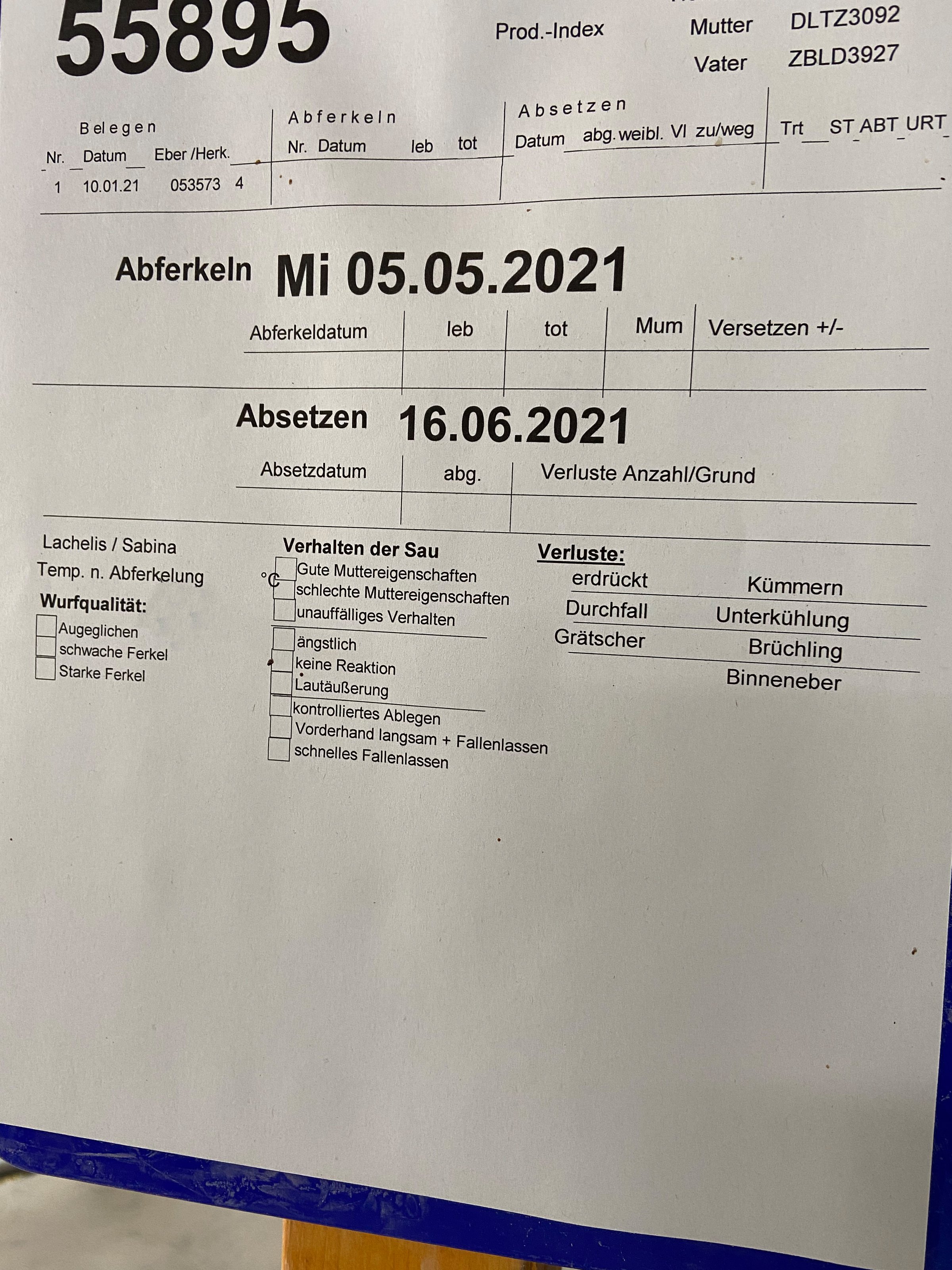 Darüber hinaus können Informationen bezüglich der Ferkelverluste und Aufzuchtleistungen als Hilfe beim Versetzen von Ferkeln dienen. Eine Sauenkarte ist wie der Personalausweis der Sau und sollte immer im Abferkelstall dabei sein (Abb. 9 und 10). Wer einen speziellen Überblick über die Muttereigenschaften der Sau bekommen möchte, kann z. B. eine sogenannte „Mütterlichkeitskarte“ (Video 5) erstellen. Anhand derer kann ein Mütterlichkeitsindex errechnet werden (kostenloses Programm), der hilft, Saugferkelverluste durch gezielte Selektion auf gute Muttereigenschaften zu reduzieren.