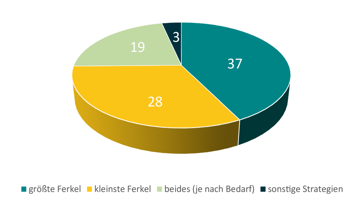 Direkt nach der Geburt ist Kolostrum eine lebenswichtige Energiequelle für jedes Ferkel. Bevor ein Wurfausgleich durchgeführt wird, sollte jedes Ferkel Kolostrum von seiner eigenen Mutter aufnehmen. Daher sollte der Wurfausgleich frühestens 12 Stunden nach der Geburt des letzten Ferkels eines Wurfes durchgeführt werden. Dies wird auch in der Praxis vorwiegend so gelebt: 48 von 89 Teilnehmenden gaben an, den ersten Wurfausgleich am 1. Lebenstag, aber frühestens nach 12 Stunden durchzuführen. 29 der Betriebe versetzen die Ferkel zum ersten Mal am 2. bis 3. Lebenstag und 10 in der ersten Lebenswoche. Jedoch ist nicht nur der Zeitpunkt des Wurfausgleiches entscheidend für den Erfolg dieser Maßnahme. Ziel des Verteilens von einzelnen Ferkeln sehr großer Würfe an andere Sauen innerhalb einer Abferkelgruppe mit weniger Ferkeln ist es, Saugferkelverluste durch Verhungern zu vermeiden und einheitliche Absetzgewichte zu erreichen. Gleichzeitig wird durch ein Abstimmen der Ferkelzahl auf die Zitzenzahl und Milchleistung das biologische Potenzial der Sau berücksichtigt. Wie die Umfrageantworten zeigen, gibt es verschiedene Strategien: Versetzen der größten oder der kleinsten Ferkel, Versetzen ganzer Würfe oder das Versetzen nach keinem festen Schema, sondern je nach Situation (Abb. 1). Festzuhalten ist, dass es betriebsindividuelle Unterschiede gibt, welche Maßnahme am besten funktioniert.
