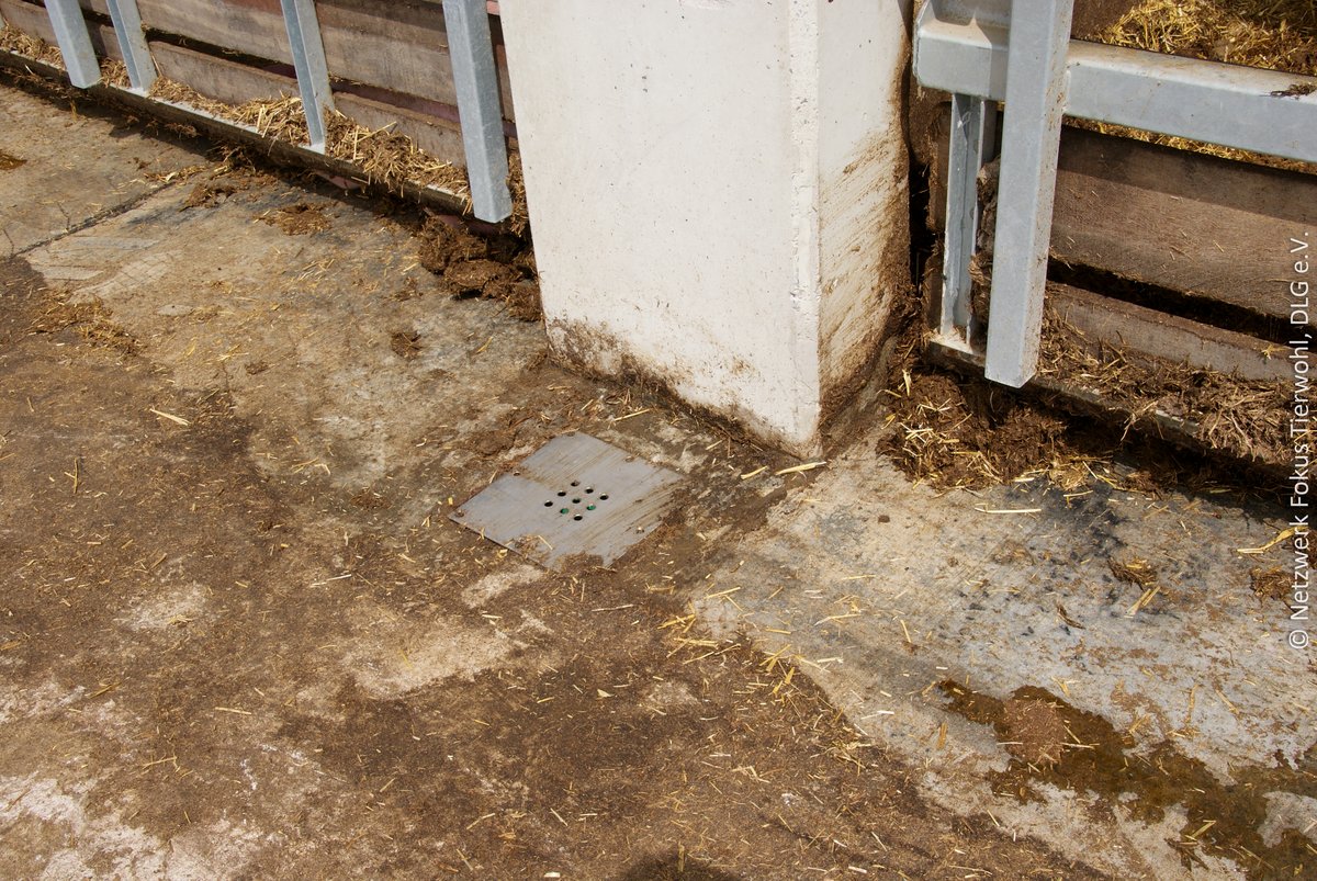 Mistlager mit Jauchebehälter besitzen keine Überdachung, weshalb sie einen Ablauf benötigen, durch den die Jauche in einen gesonderten Behälter geleitet wird (Abb. 14). Ein Gefälle mit 2 %iger Neigung zur Jaucherinne unterstützt das Abfließen von Flüssigkeiten in das Jauchelager.12,14 Es eignen sich z. B. Muldenrinnen, die auch häufig bei Tankstellen verwendet werden.14 Dabei muss darauf geachtet werden, dass diese stets frei sind, sodass ein Abfluss gewährleistet ist. Eine Tauchpumpe kann Jauche vom Sammelbehälter in das Güllelager pumpen. So können Kosten und die erforderliche Größe des Sammelbehälters reduziert werden.14