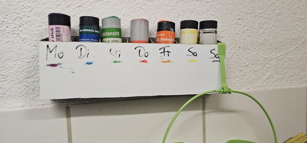 Nehmen Sie immer einen Markierstift oder -spray mit, wenn Sie in den Stall gehen! So sind Sie stets einsatzbereit um beißende Schweine zu kennzeichnen! Mit dem Spray hat man eine größere Reichweite und erreicht in der Bucht z.T. noch flüchtende Tiere. Um vom Mittelgang aus zu kennzeichnen hilft eine Verlängerung für den Markierstift (Eigenbau).
