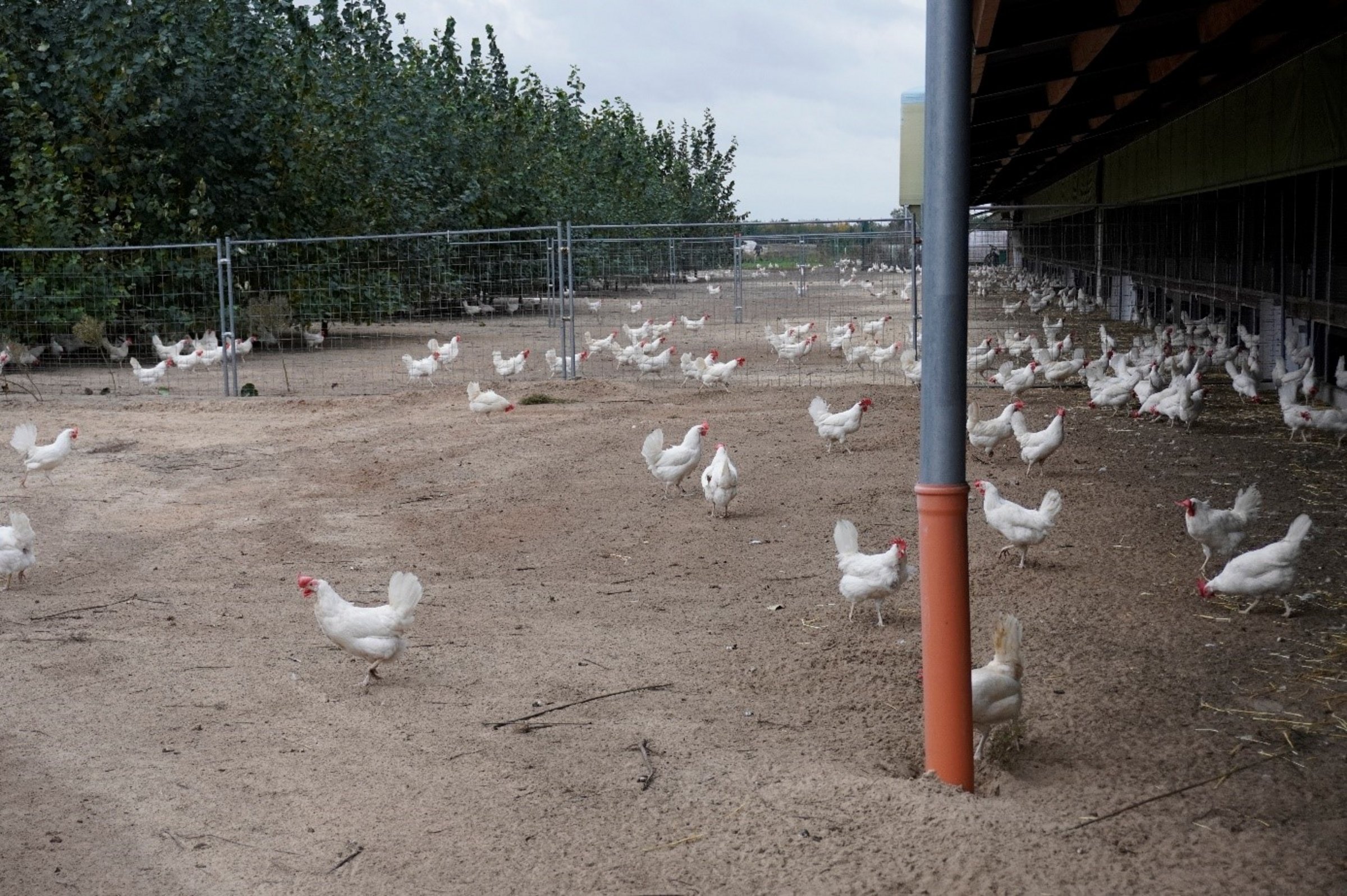Im Jahr 2018/19 baute die Familie einen neuen Volierenstall für 15.000 Legehennen. Dabei wurde beschlossen, in Zusammenarbeit mit der Firma Wald21 einen Teil des Auslaufs mit Pappeln zu bepflanzen. Vorteil dieses Systems ist die verbesserte Auslaufnutzung durch die Legehennen, dank dem Schutz der Bäume. „Sobald am Morgen die Klappen auf gehen, stürmen nahezu alle Hühner in den Auslauf. Im sicheren Dickicht der Pappeln sind immer wieder Tiere beim Sandbaden und Ruhen zu beobachten. Am Abend finden sich die Hühner von alleine wieder im Stall ein und es gibt keine Probleme mit Tieren die in den Bäumen bleiben“, erzählt Michael Engling. Ein weiterer positiver Aspekt ist, dass zum Zeitpunkt der Exkursion keine Anzeichen für Federpicken oder Kannibalismus beobachtet werden konnten. Die Herde befand sich in der 58. Lebenswoche und machte einen ruhigen und gelassenen Eindruck.
