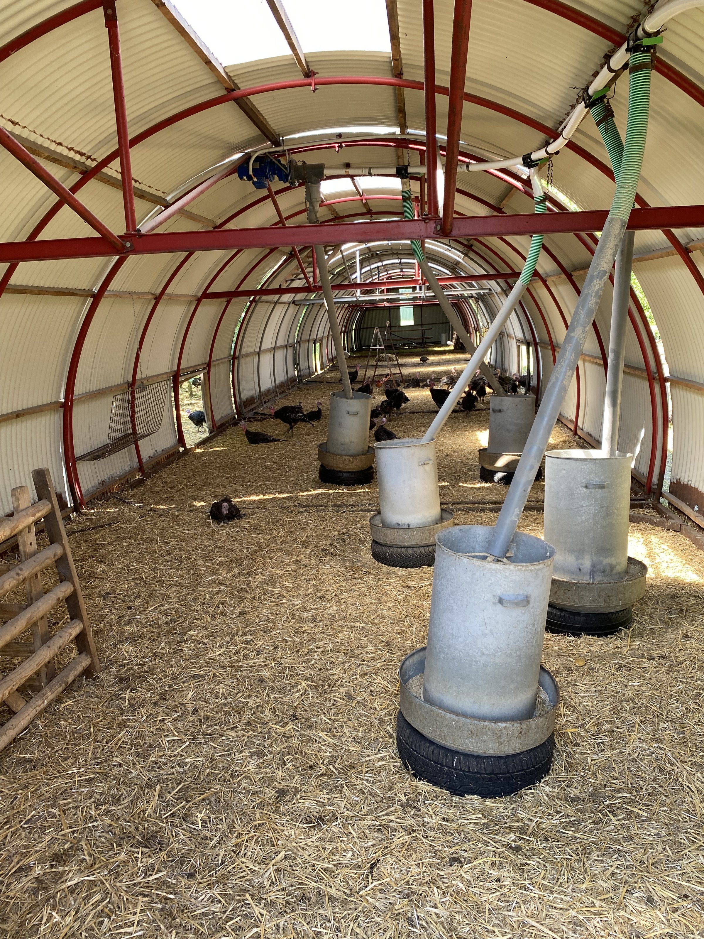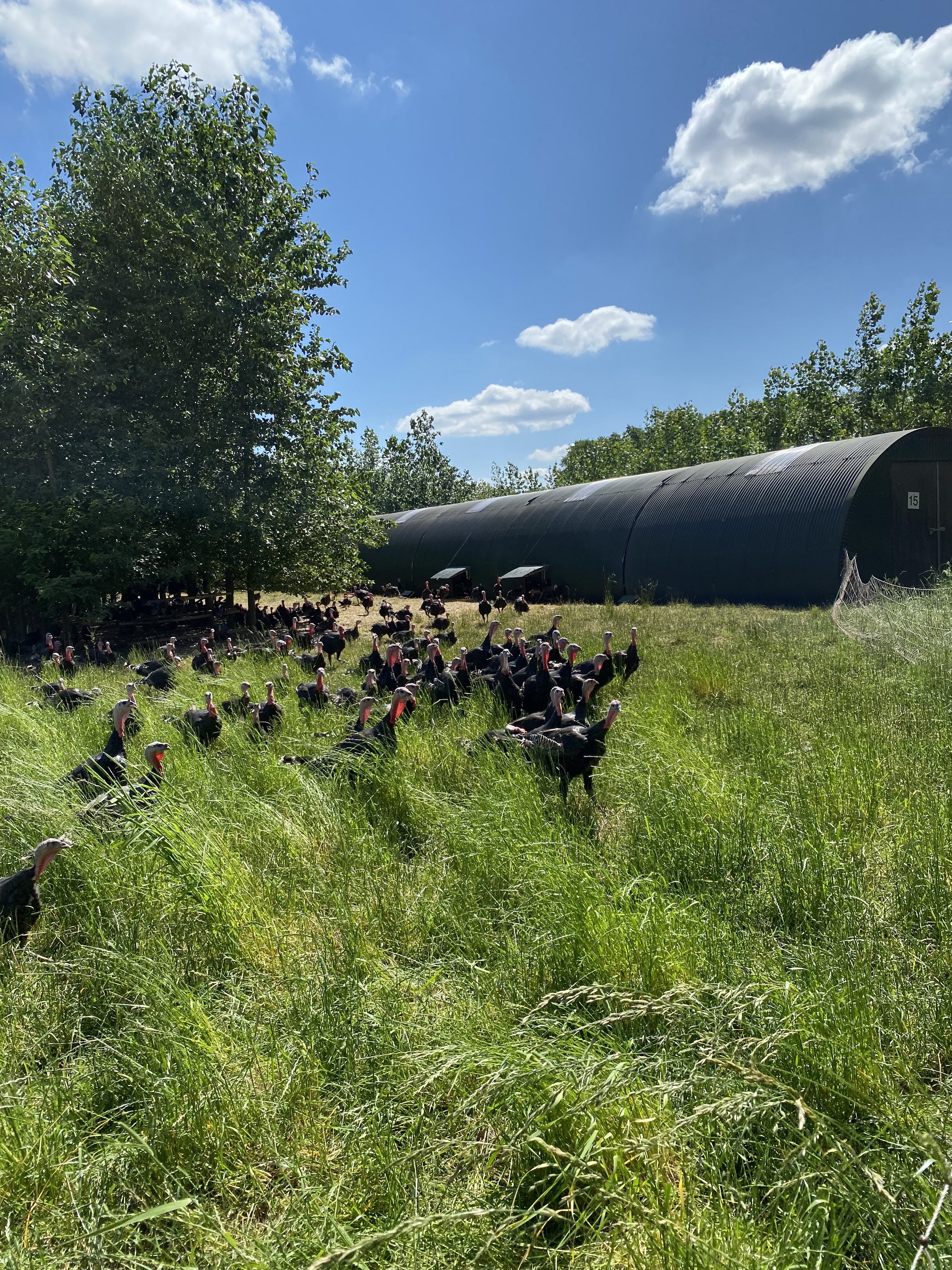 Die Tiere werden in den mobilen Einheiten mit für den Betrieb eigens hergestelltem Futter gefüttert. „Auch hierzu haben wir ein Versuch gemacht, indem wir den Tieren alle Futterkomponenten einzeln in Futterschalen angeboten haben. Aus dem gefressenen Verhältnis wurde dann die Futtermischung kreiert und somit den Bedürfnissen der Tiere angepasst.“ Durch ein mobiles Futtersilo und einer einfachen Rohrschneckenanlage wird die Versorgung der Tiere in den Tunneln sichergestellt. „Für ein solches System braucht man Infrastruktur, weshalb wir an die jeweiligen Standorte Strom, Wasser und ein Telefonkabel für eventuelle Überwachungsfunktionen gelegt haben. Im Sommer haben wir unsere mobilen Einheiten zwischen den hohen Pappeln stehen, die eine Menge an Schatten werfen, im Winter verwenden wir hingegen Standorte ohne Bäume, um die Kraft der Sonne zu nutzen die dunkelgrün lackierten Tunnel weitestgehend warm zu halten“. Die Puten werden gemischtgeschlechtlich aufgezogen und erreichen zwischen dem sechsten und siebten Monat die Schlachtreife (Henne 8,5 kg, Hahn 14,5 kg). Insgesamt hat Familie Haver-Rassfeld für die Putenhaltung 15 ha landwirtschaftliche Nutzfläche als Freilandfläche zur Verfügung.