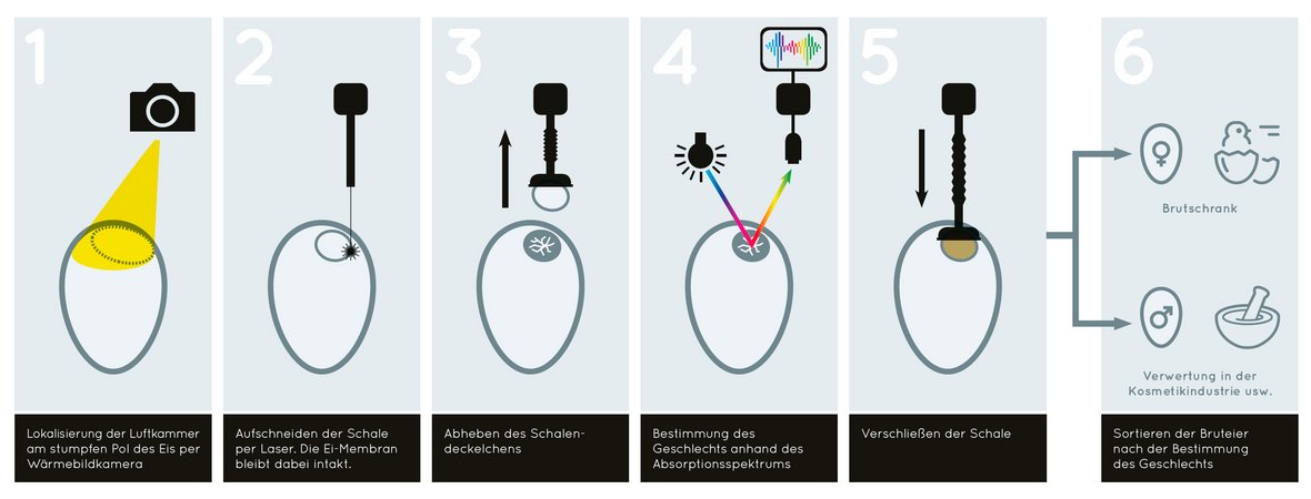 Per Wärmebildkamera wird am 4. Bruttag die Luftkammer im Ei lokalisiert und per Laser ein ca. 15 mm großes Loch in die Eischale geschnitten, ohne hierbei die Eimembran zu beschädigen. Anschließend wird mittels eines speziellen Verfahrens, das als Raman Spektroskopie bezeichnet wird, ein Blutgefäß mit ausreichendem Durchmesser durchleuchtet. Die Streuung bestimmter Lichtstrahlen ist spezifisch für männliche und weibliche Tiere und kann somit Auskunft auf das Geschlecht des Embryos im Ei geben. Zum Abschluss wird die Öffnung in der Eischale mittels eines biokompatiblen Klebebandes wieder verschlossen. In Forschungsarbeiten wurde eine Zuverlässigkeit von 90-93% und eine Schlupfrate von 81-96% festgestellt. Für diese Technik konnte noch kein Termin zur Markteinführung benannt werden12,13.