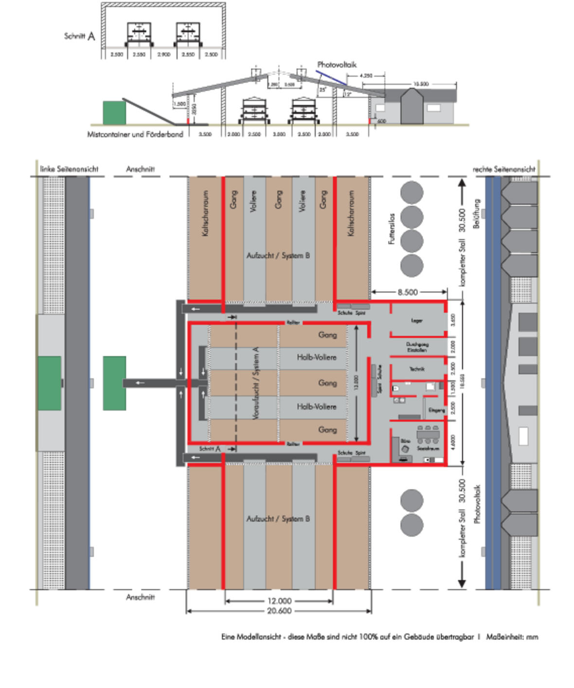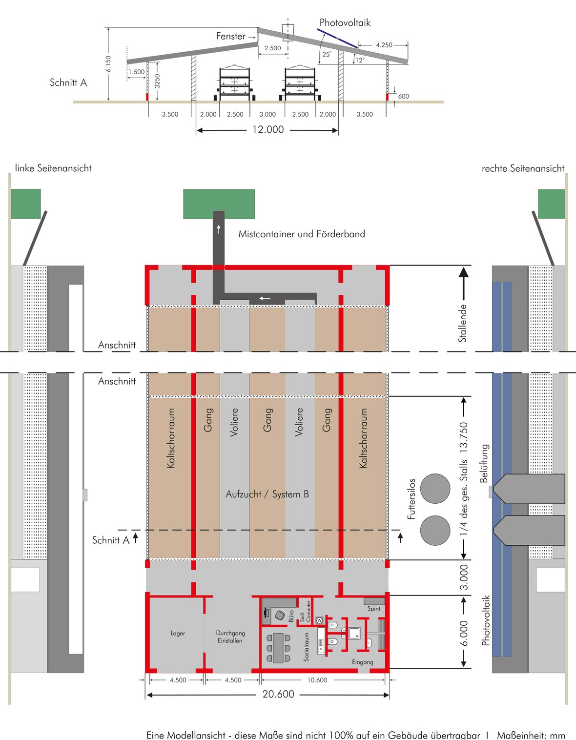 - Innenstallbereich: zwei Außengänge: möglichst breit (je 2,0 Meter) + Mittelgang: möglichst breit (3 m) + 2 Volierenanlagen à 2,50 m ➞ Breite des Innenstalles: 12 m + 3,5 m Außenklimabereich je Seite + Dachüberstand (je 1,5 m)