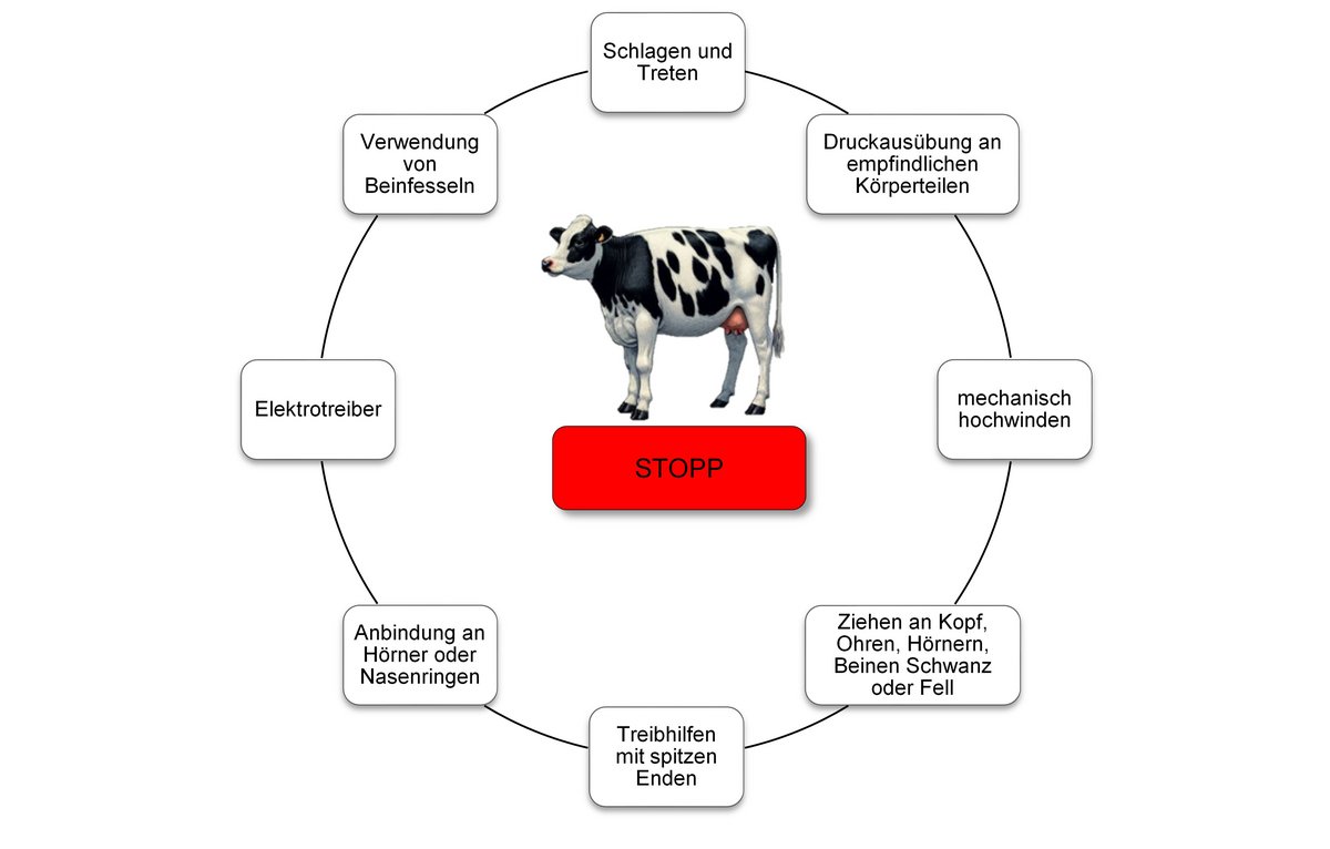 Das Ver- und Entladen stellt meist die belastendste Phase eines Transportes dar. Ein ruhiger, stressarmer Umgang mit den Rindern ist daher besonders wichtig. Ordnungsgemäßes und umsichtiges Ver- und Entladen trägt wesentlich dazu bei, den Stress der Tiere so gering wie möglich zu halten. Unzulässige Praktiken sind zu vermeiden (Abbildung 5). Vor der Verladung ist die Transportfähigkeit der Tiere gemäß Verordnung (EG) Nr. 1/2005 zu kontrollieren.