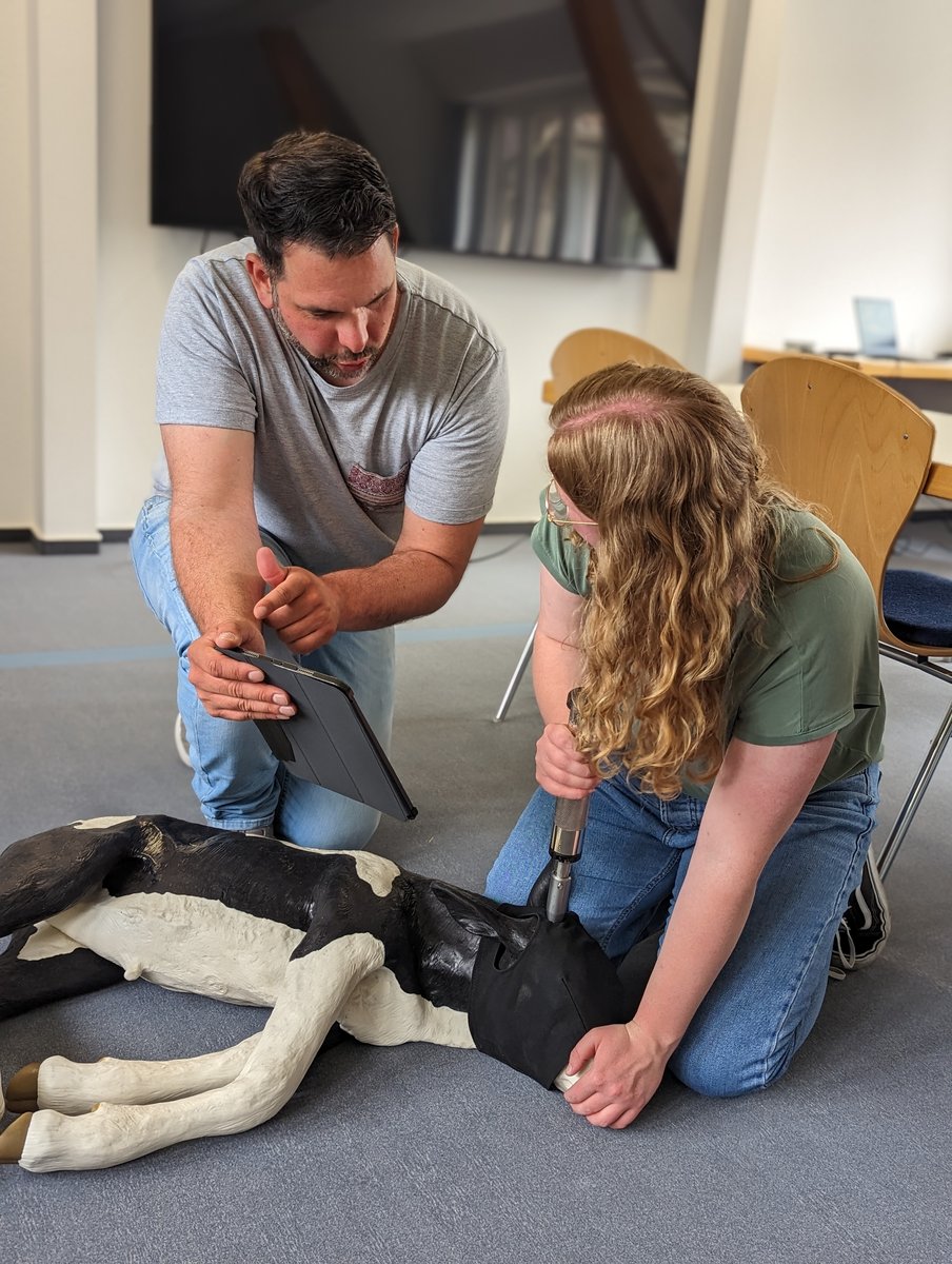 Bei der Methodik der Wissensvermittlung soll vor allem auf intuitive Methoden zurückgegriffen werden, die hohe Praxis- und Lernerfahrungen versprechen. Eine vielversprechende Methode, die heute immer weiteren Eingang findet, ist das immersive Lernen, das neue digitale Technologien wie Virtual Reality (VR = computergeneriertes, oft dreidimensionales Abbild der Wirklichkeit), Augmented Reality (AR = computergestützte Darstellung der Wirklichkeit mit Ergänzung virtueller Aspekte) und simulationsgestützte Systeme (z.B. an veterinärmedizinischen Modellen) didaktisch nutzbar macht. Vor allem bei tierschutzsensiblen Maßnahmen können durch den Einsatz von sensorgestützten Demonstratoren Routinen und Fertigkeiten tierschonend und praxisnah erlernt werden. Für die überbetriebliche Ausbildung von Landwirt:innen wurde im landwirtschaftlichen Versuchs- und Bildungszentrum Haus Düsse eine immersive Lerneinheit zum Thema „Enthornen von Kälbern“ entwickelt, die seit 2023 eingesetzt wird (Abbildung 4).