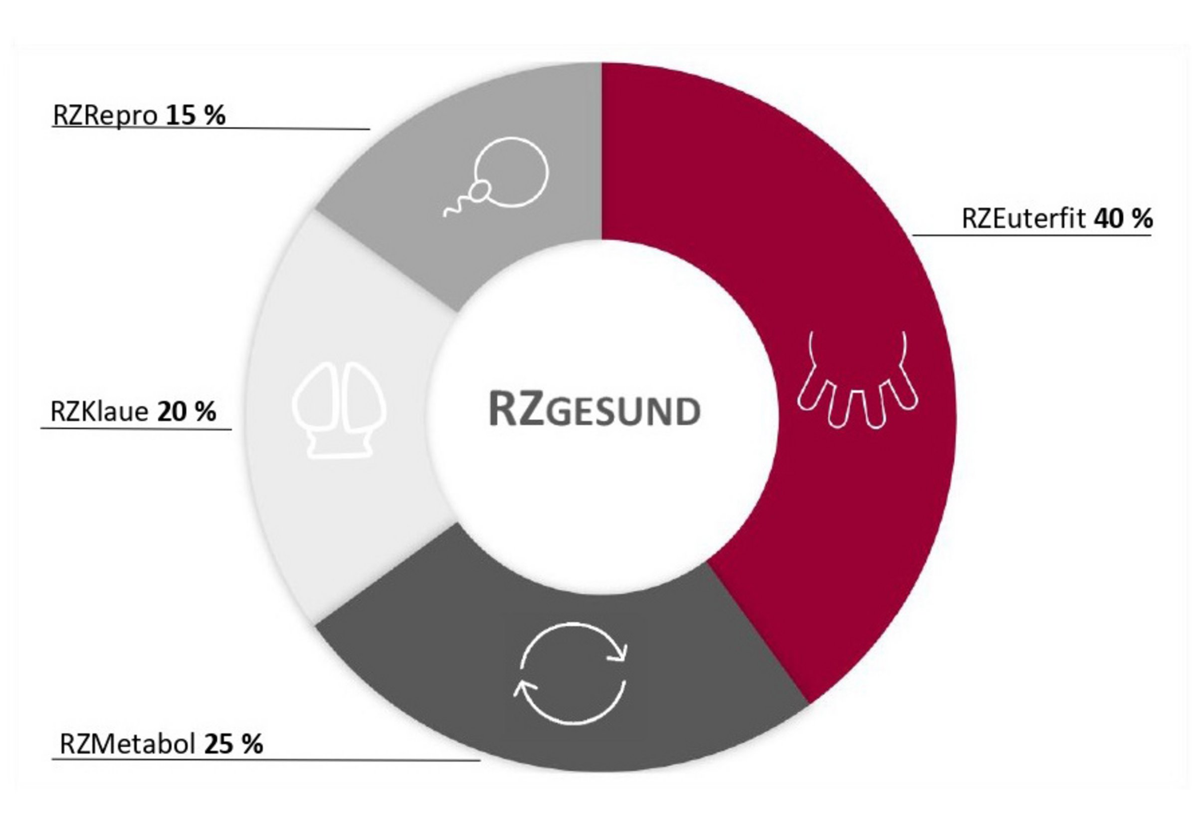 Der Gesamtzuchtwert RZGesund umfasst ingesamt 13 Einzelmerkmale aus vier Merkmalskomplexen: