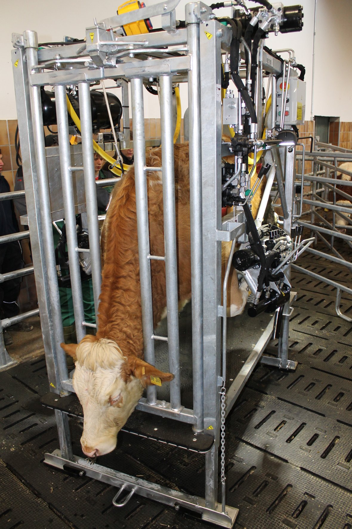 Mit individuell anpassbaren Bauchgurten und Oberschenkelschlaufen kann das Tier fixiert werden, wodurch Verletzungen während der Arbeit am Tier verhindert werden sollen. Je nach Hersteller können auch Ketten mit Plastikummantelung oder Seile zum Einsatz kommen. Durch eine individuelle Anpassung soll gewährleistet werden, dass Nerven und Blutgefäße an den jeweiligen Körperregionen nicht gequetscht werden. Durch die komplette Fixierung kann die Kuh ihre Haltung und Position nicht stark verändern, was das Risiko von Verletzungen minimiert. Auch um Verspannungen der Muskeln oder Überstreckungen der Gelenke mit Zerrungen der Sehnen und Bänder vorzubeugen, sollen die Gliedmaßen nur in natürlicher Haltung fixiert werden. Bei einer Fixierung durch einen W-Bügel wird zudem gewährleistet, dass die Gliedmaßen auch seitlich gesichert sind und eine Klauenhornkorrektur im Millimeterbereich sicher durchgeführt werden kann (Abb. 2 & 3).