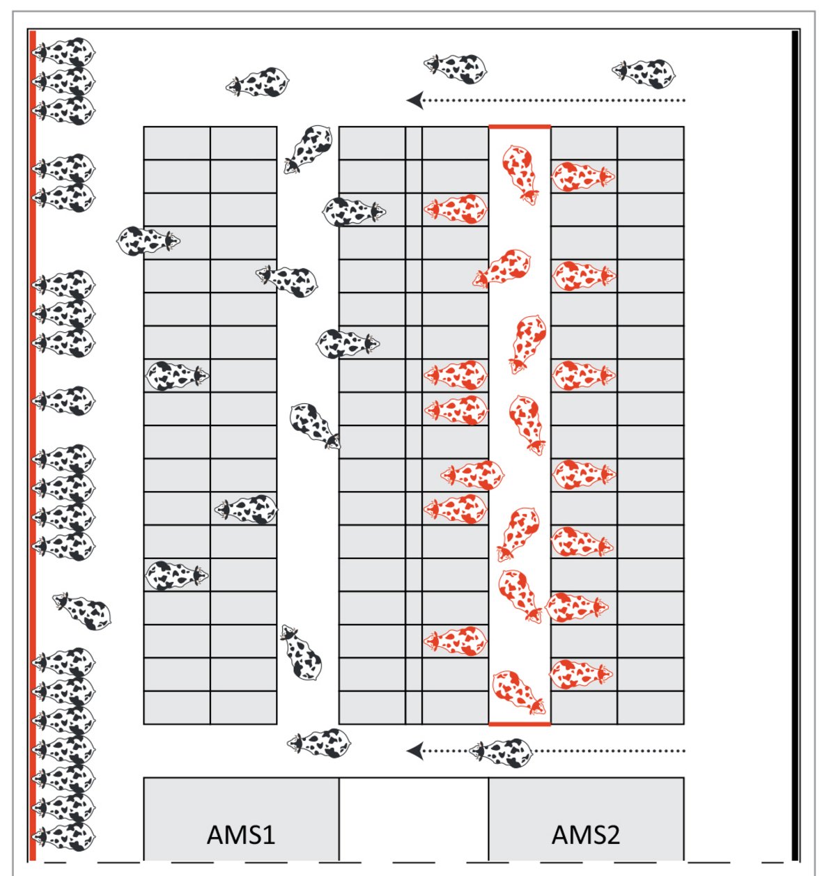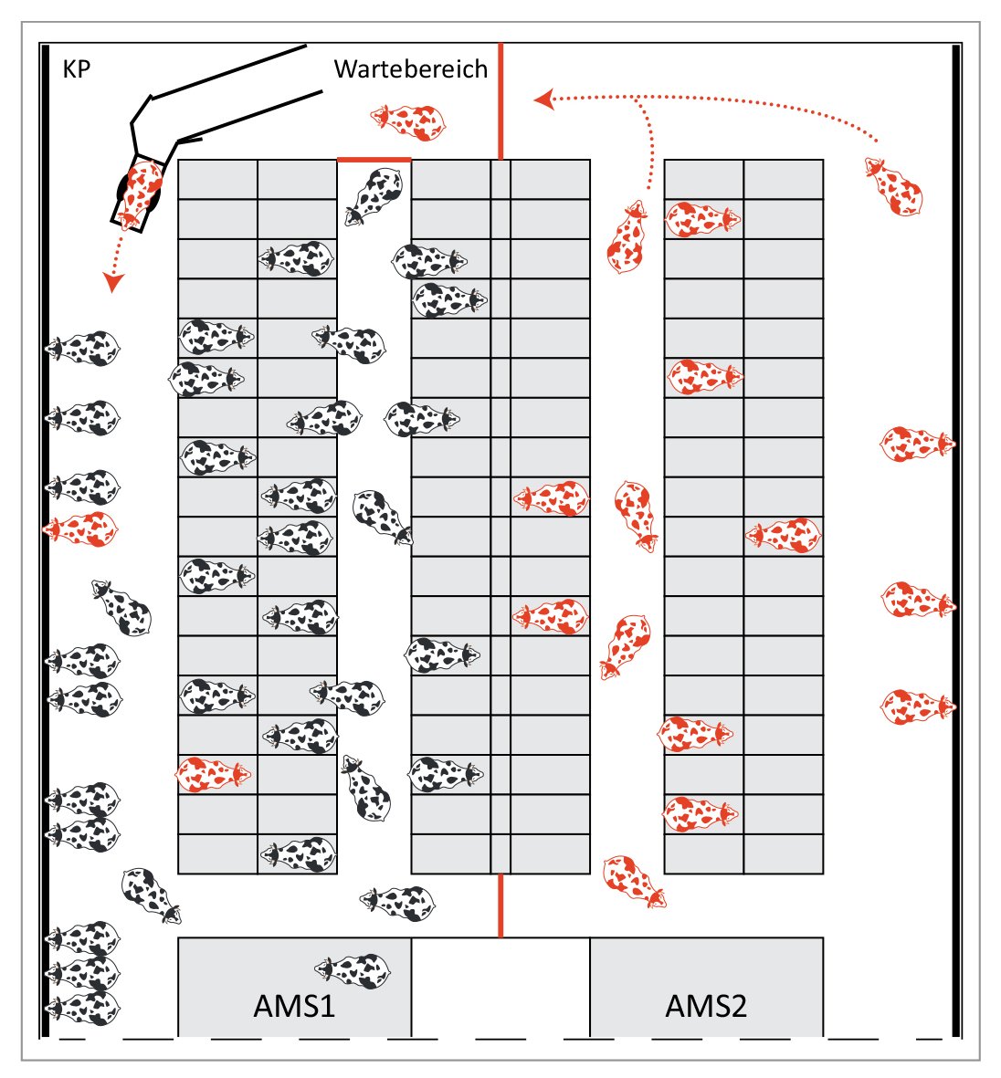 Ein möglicher Verfahrensablauf im AMS-Betrieb, in dem nur Teile der Herde gepflegt werden sollen, ist beispielhaft und schematisch in Abbildung 1 dargestellt.