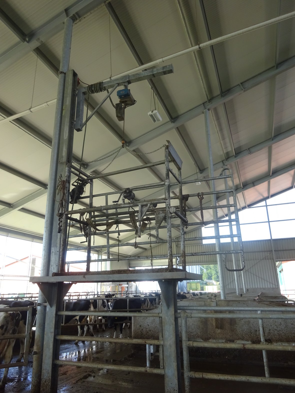 Bei der Eigenbestandspflege kleiner Gruppen kann eventuell eine alternative Anordnung von Klauenpflegestand und Zuführung in Betracht gezogen werden. Eine pfiffige Lösung ist beispielsweise die Aufbewahrung des Standes oberhalb des Tierbereichs im Rahmen einer Aufhängung (Abb. 7). Bei Bedarf kann der Stand mit den notwendigen Abtrenngittern unter Einhaltung der Arbeitsschutzvorgaben (SVLFG) abgelassen werden.