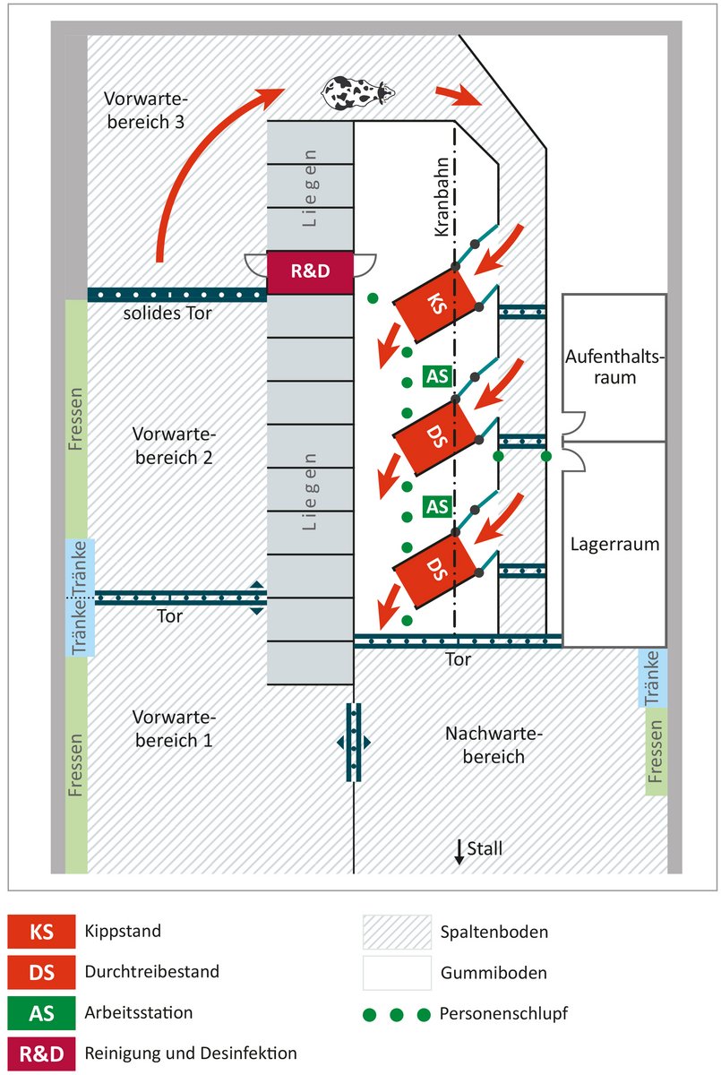 Den Betrachtungen liegt beispielhaft ein Betrieb mit 120 melkenden Kühen zugrunde. Dabei führen folgende Entscheidungen zu unterschiedlichen Konzepten für die Organisation und Integration der Klauenpflege:
