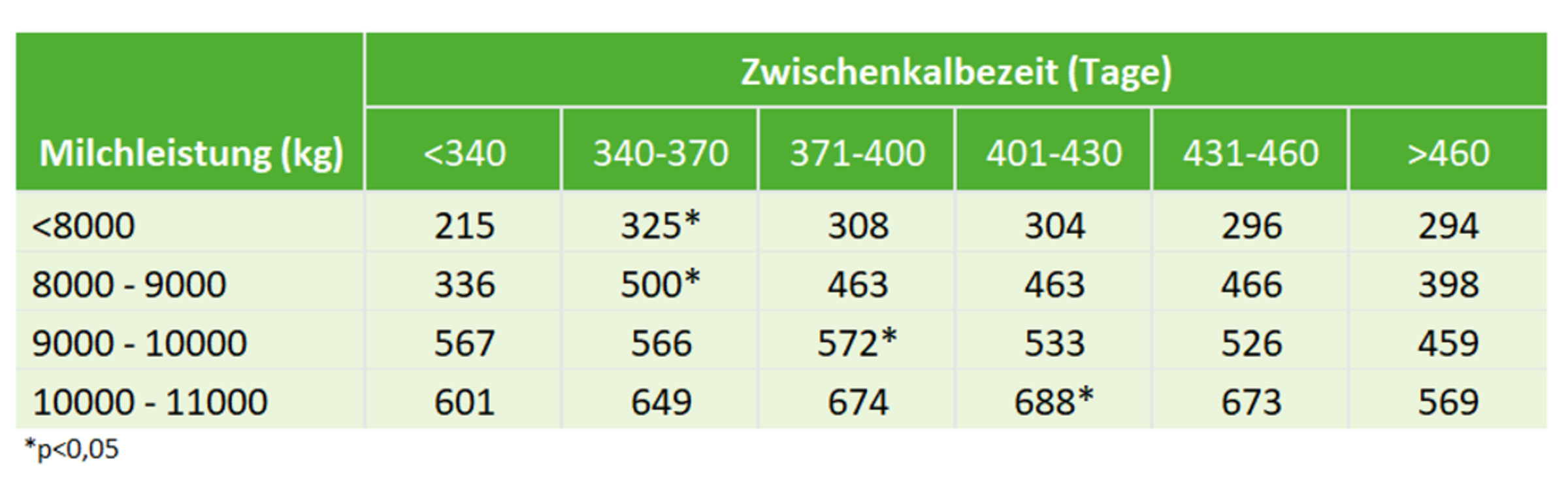 Im Vergleich zwischen Zwischenkalbezeiten von 400 Tagen zu Zwischenkalbezeiten von 500 Tagen hatte sich bei einem Projekt „OptiLak – Auswertungen zur optimalen Laktationsdauer bei differenzierten Milchmengen“ gezeigt, dass wenn Erlöse und Kosten zusammen betrachtet werden, sich der Deckungsbeitrag von Milchkuhbetrieben mit Zwischenkalbezeiten von 500 Tagen erhöht, solange die Reproduktionsrate bewusst verringert wird.