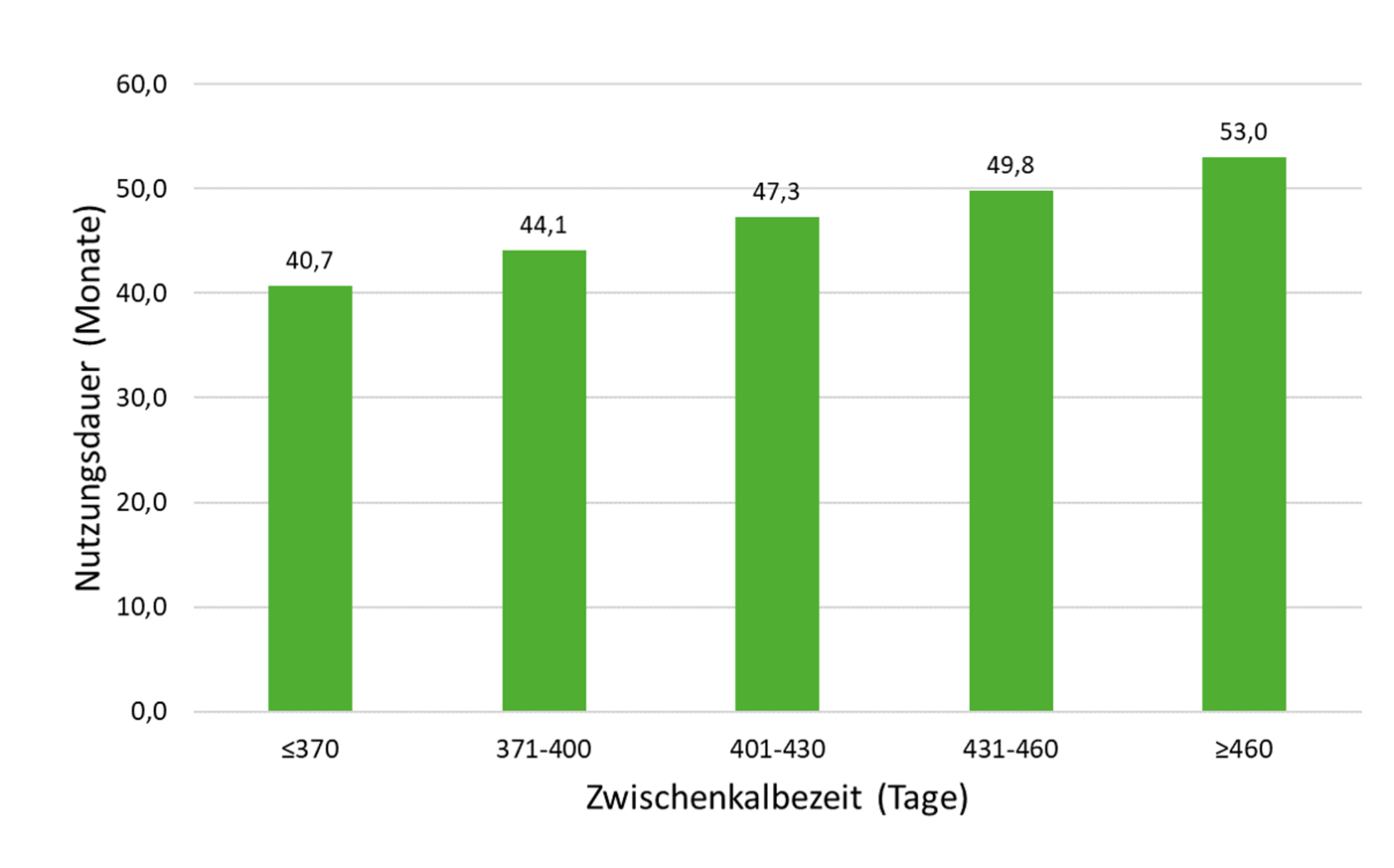 Ein großer Vorteil einer verlängerten ZKZ besteht in der längeren Nutzungsdauer der Milchkühe, die aktuell ebenfalls im Fokus steht. Dadurch, dass später besamt wird und die Kühe schneller tragend werden, bleiben sie länger im Bestand. Sie gelten nicht nach zwei bis drei erfolglosen Besamungen als unfruchtbar und gehen frühzeitig ab. Durch den größeren Abstand zwischen den Abkalbungen ist die Wahrscheinlichkeit einer Stoffwechselerkrankung oder einer Mastitis geringer. Die verringerte Anzahl an Abkalbungen führt dazu, dass die Kühe im Verlauf der Nutzungsdauer weniger häufig in die kritische Phase rund um die Geburt kommen. Der Aufwand für Geburtsüberwachung und entstehende Behandlungs- und Tierarztkosten in Zusammenhang mit der Geburt und Frühlaktation werden daher automatisch reduziert. Eingeschlossen ist auch die Eutergesundheit, da die Kühe bei einer geringeren Milchleistung trockengestellt werden. Je mehr die Zwischenkalbezeit verlängert wird, desto länger ist die Nutzungsdauer der Milchkühe (siehe Abbildung 3).