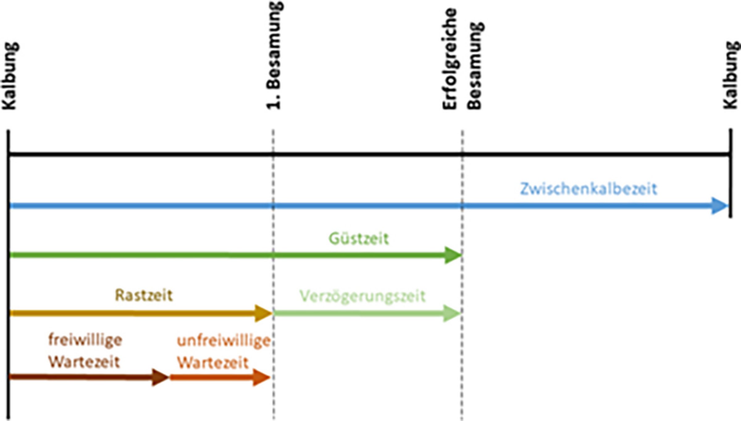 - Verzögerungszeit (VZ): Zeit von der ersten Besamung nach der Kalbung bis zur erfolgreichen Belegung