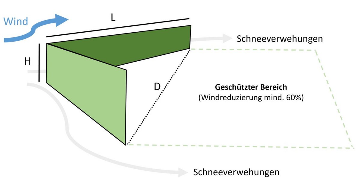 Gibt es auf den Flächen keinen, natürlich gewachsenen Windschutz für die Tiere, so besteht die Möglichkeit Windschutzwände zu errichten. Diese sind im Idealfall:
