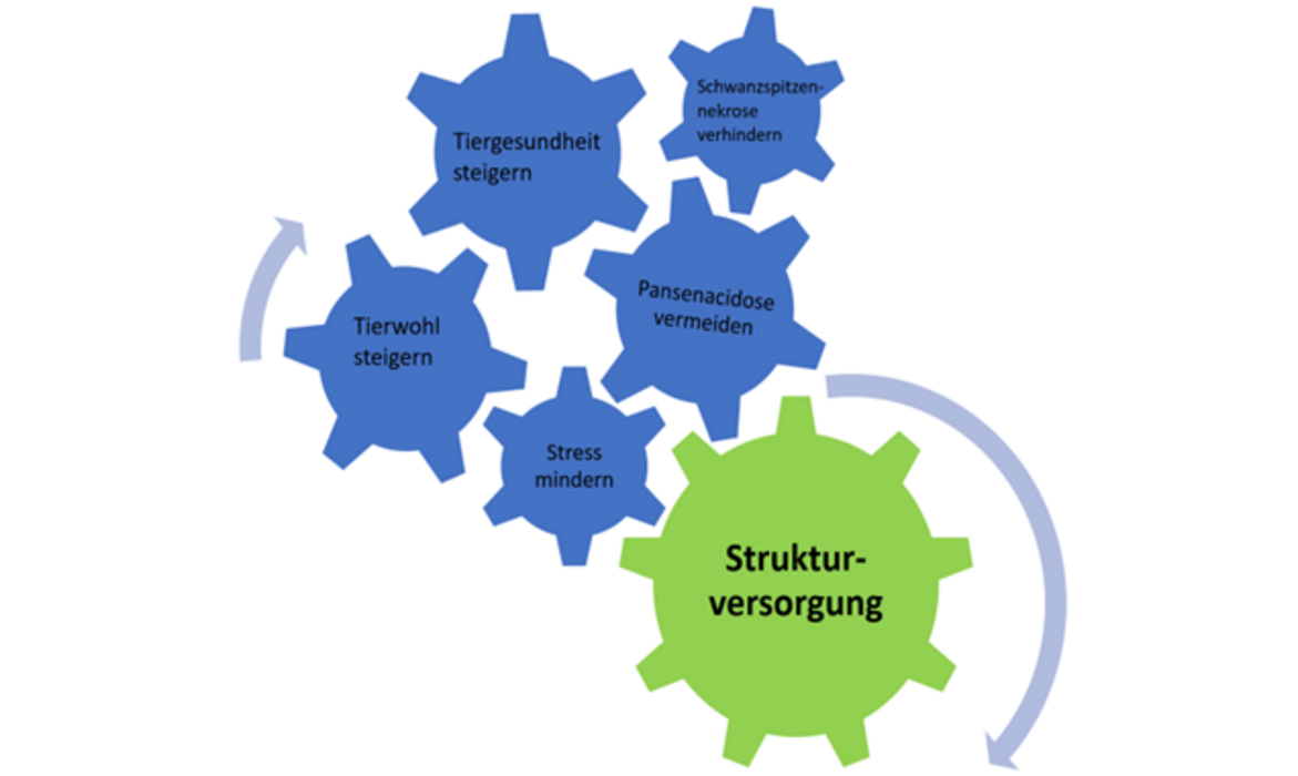 - eine Futterstruktur, die das Wiederkäuen und die Einspeichelung des Futters fördert (Speichel hat auch eine Pufferwirkung),