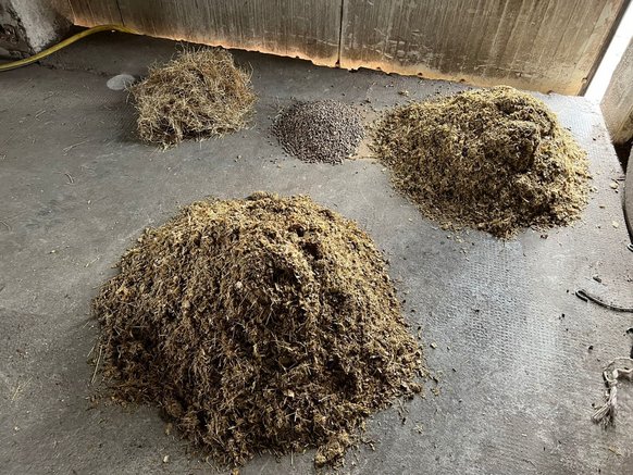 Beispielsration für einen Mastbullen: Oben Einzelbestandteile (125 g Mineralfutter, 300 g Häckselstroh (Alternative: Grassamenheu), 2,5 kg Kraftfutter, 16 kg Maissilage), unten gemischt.