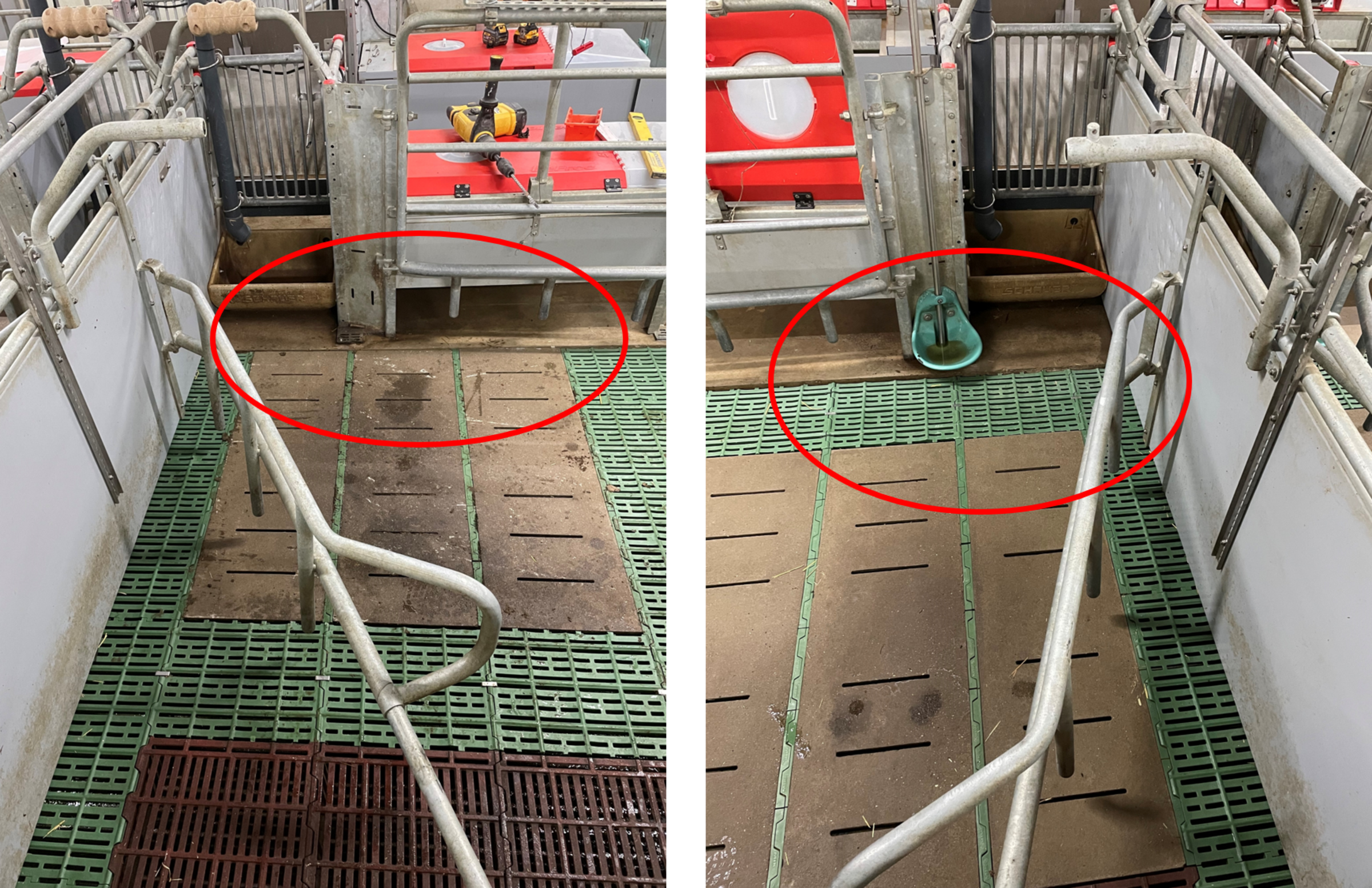 Die Bucht hat das Ferkelnest und den Futtertrog am Gang. Damit sind die wichtigen Elemente für die tägliche Tierkontrolle schnell einsehbar. Bei der Anordnung sollte unbedingt verhindert werden, dass „Problem-Ecken“ entstehen, in die die Sauen rückwärts „einparken“ können. Bei der Geburt können die Ferkel dort nicht schnell genug von der Sau weg (Bild 4). Das Risiko von Erdrückungsverlusten steigt. Zunächst wurden Ketten vor dem Trog eingehängt, die dort ein Abliegen verhindern sollten. Später wurde die Mutter-Kind-Tränke versetzt und der Trog weiter Richtung Buchtenmitte positioniert. Die Sauen hatten dadurch mehr Kopffreiheit und die Erdrückungsverluste konnten reduziert werden.