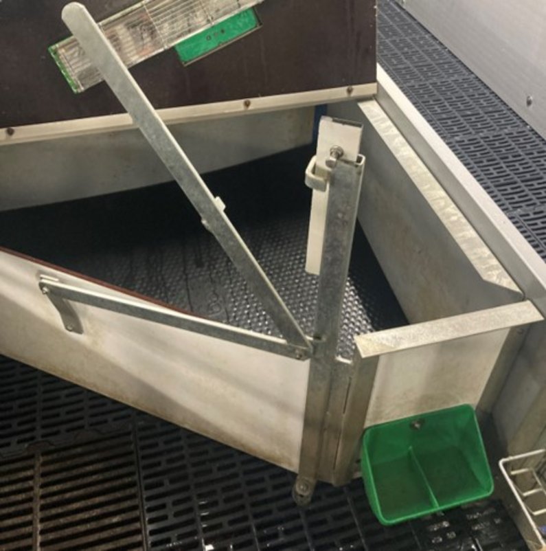 Die Agrarprodukte Bernsgrün-Hohndorf eG aus Thüringen konnte im Frühjahr 2018 ihre beiden neuen Abferkelabteile mit jeweils 130 quadratischen Bewegungsbuchten der Firma Vissing in Betrieb nehmen. Die Markterkundung, der Neubau sowie die folgenden Betriebserprobungen und –anpassungen werden im Rahmen von EIP-Agri-Projekten begleitet. Herr Franz berichtete, dass sich die Mitarbeiter und Tiere zu Beginn an das neue System gewöhnen mussten und schon nach kurzer Zeit die ersten Anpassungen erfolgten. Neben Anpassungen der Stalltemperatur wurden kleinere Umbaumaßnahmen an den Abferkelbuchten vorgenommen. Die Kollegen des Betriebes brachten eine Sicherung gegen das Herabfallen des Deckels vom Ferkelnest an (Bild 1), damit dieser nach der Kastration unter Isoflurannarkose geöffnet bleibt und somit das Ersticken der Ferkel verhindert. Des Weiteren befestigten sie das Einstiegsbrett für die Mitarbeiter (Bild 2), da die älteren Ferkel dieses regelmäßig hochschoben und dann im Gang „spazieren“ gingen. Nach zwei Jahren gingen die ersten Ferkelnester auf Grund von Materialermüdung kaputt. Diese Problematik konnte gemeinsam mit dem Stallausrüster gelöst werden, so dass die neueren Modelle länger halten. Aktuell wird noch nach einer Lösung für ein Problem mit dem Standfuß vom Ferkelschutzkorb gesucht. Ist der Korb geöffnet, kommt es aktuell häufig zu Verletzungen an den Ferkelklauen (Bild 3).