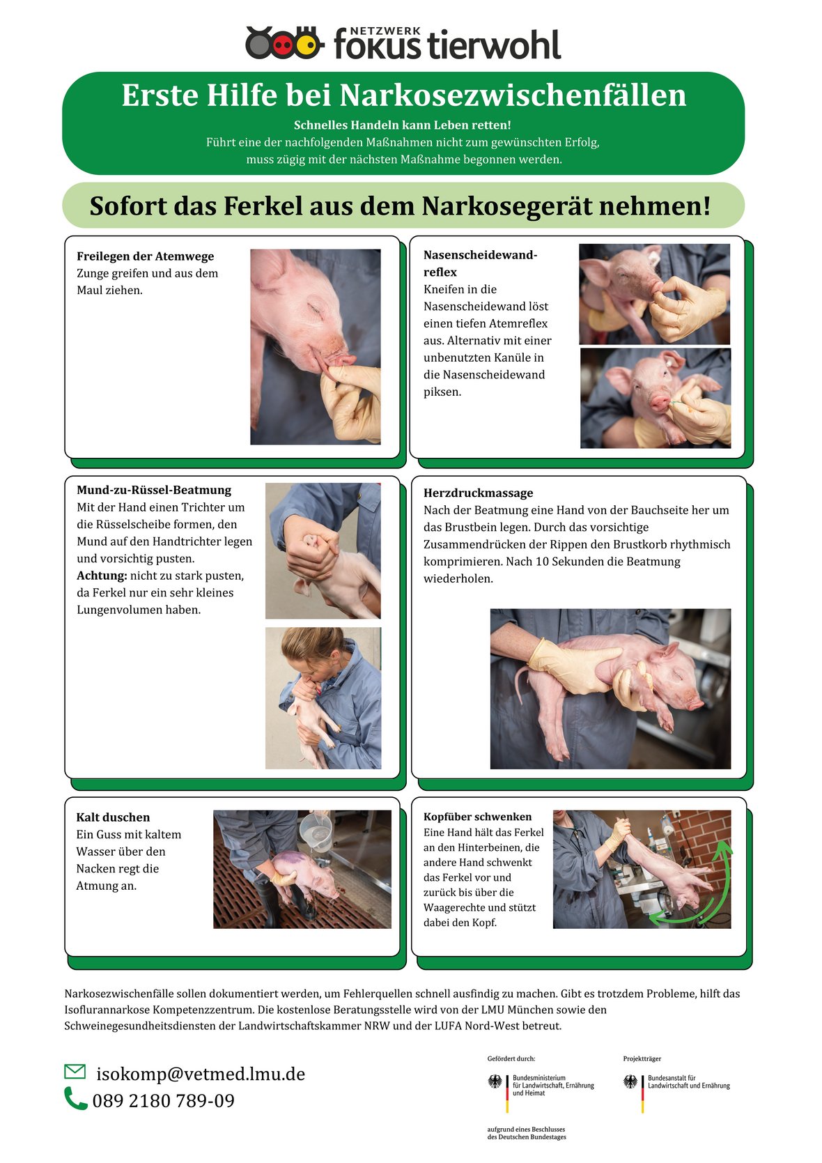 Das Tierwohlkompetenzzentrum Schwein im Netzwerk Fokus Tierwohl hat in Kooperation mit dem Projekt „Isoflurannarkose-Kompetenzzentrum“, gefördert durch das Bundesministerium für Ernährung und Landwirtschaft, ein Stallposter zu Erste-Hilfe-Maßnahmen beim Saugferkel erstellt.