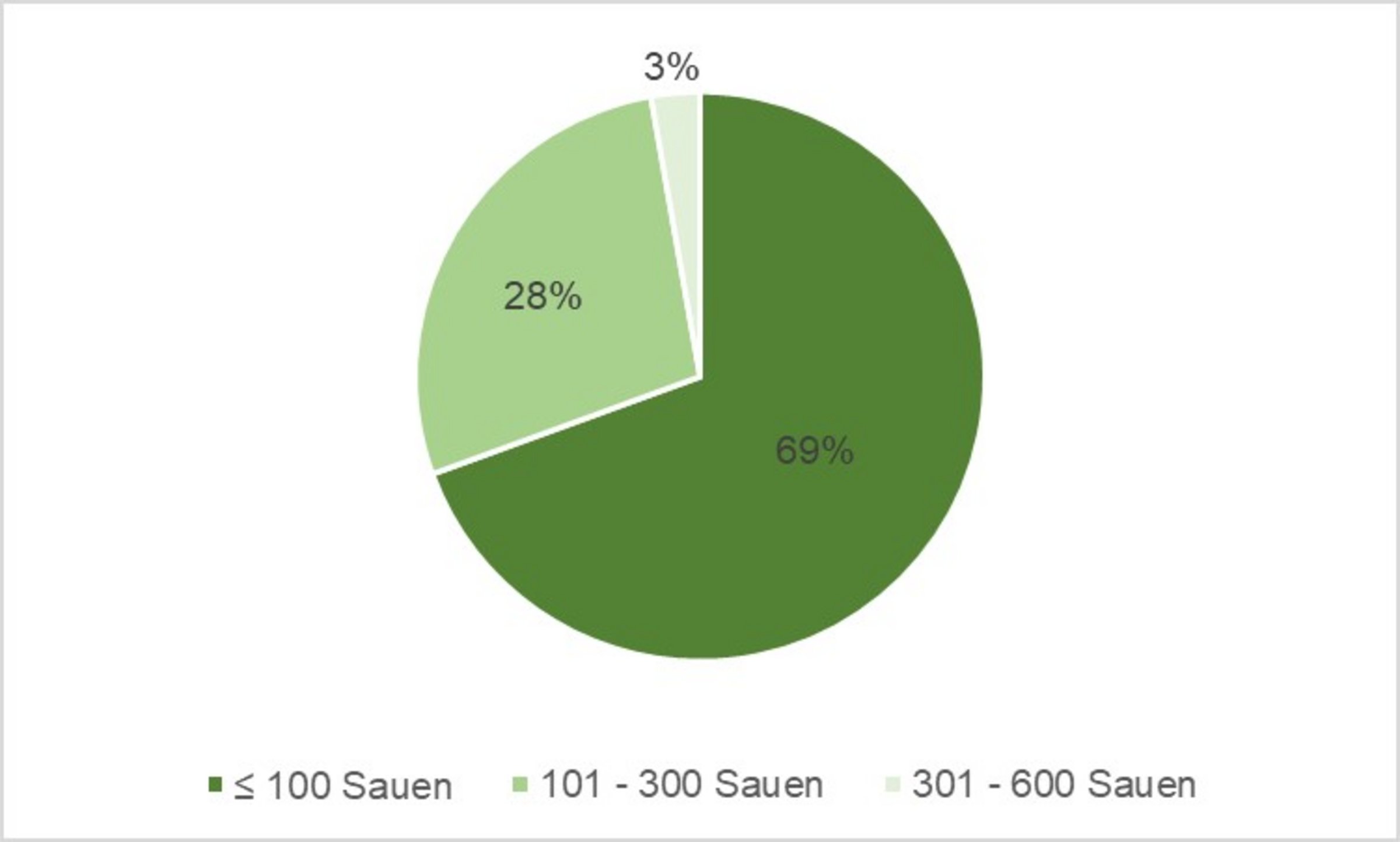Das Tierwohl-Kompetenzzentrum Schwein des Netzwerks Fokus Tierwohl rief im vergangenen Jahr Sauenhalter auf, ihre Praxiserfahrungen mit Bewegungsbuchten und der freien Abferkelung zu teilen. Die Umfrage, die im Rahmen der Arbeit der AG Saugferkelverluste entstanden ist, bündelt die bisherigen Erfahrungen aus der Praxis. Die Erfahrungen zum Einsatz von Bewegungsbuchten finden Sie hier. An der Umfrage nahmen insgesamt 214 Sauenhalter aus ganz Deutschland, Österreich und der Schweiz teil. Von ihnen gaben 80 Teilnehmer an, mit der freien Abferkelung zu arbeiten. Dabei können 36 Betriebe auf mehr als 5 Jahre Erfahrung zurückgreifen. Weitere 27 Teilnehmer betreiben bereits seit 1 – 5 Jahren die freie Abferkelung. Bezogen auf die Anzahl der Freilaufbuchten im Betrieb gab es, anders als bei den Umfrageteilnehmern mit Bewegungsbuchten, nur 5 Sauenhalter, die bisher nur eine geringe Anzahl von Buchten zum Testen eingebaut haben. Bei 56 Betrieben ermöglichen bereits alle Buchten im Abferkelstall die freie Abferkelung. Die Vermutung, dass es sich bei den Betrieben mit freier Abferkelung vorwiegend um ökologisch wirtschaftende Betriebe handelt, bestätigen die Antworten in der Umfrage nicht. Die Verteilung der ökologisch und konventionell wirtschaftenden Betriebe war ausgeglichen. Ein Blick auf die angegebenen Betriebsgrößen zeigt, dass es sich bei den Teilnehmern vorwiegend um Betriebe mit weniger als 100 Sauen handelt (Abb. 1). Nicht alle Umfrageteilnehmer machten eine Angabe dazu, wo ihr Ferkelerzeugerbetrieb liegt. Abbildung 2 zeigt die Verteilung der Betriebe, die ihren Standort angaben.
