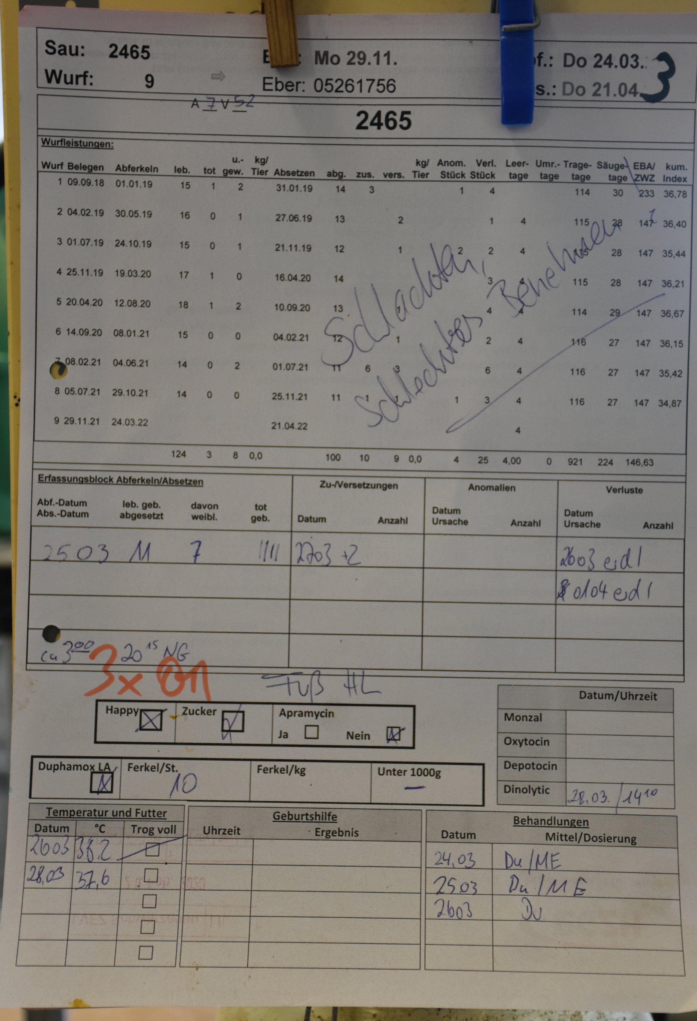 Darüber hinaus können Informationen bezüglich der Ferkelverluste und Aufzuchtleistungen als Hilfe beim Versetzen von Ferkeln dienen. Eine Sauenkarte ist wie der Personalausweis der Sau und sollte immer im Abferkelstall dabei sein (Abb. 9 und 10). Wer einen speziellen Überblick über die Muttereigenschaften der Sau bekommen möchte, kann z. B. eine sogenannte „Mütterlichkeitskarte“ (Video 5) erstellen. Anhand derer kann ein Mütterlichkeitsindex errechnet werden (kostenloses Programm), der hilft, Saugferkelverluste durch gezielte Selektion auf gute Muttereigenschaften zu reduzieren.