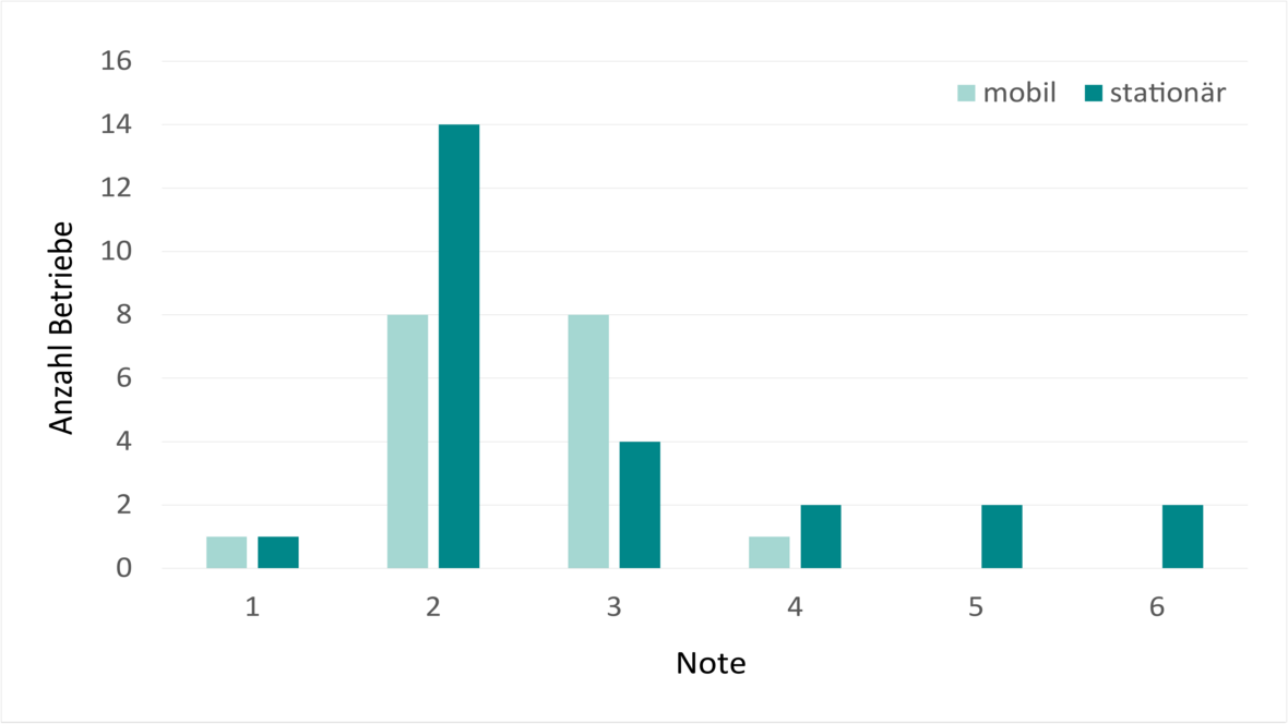 Bzgl. der Zufriedenheit wurde nach der Bewertung der technischen Ammensysteme in Schulnoten bei den Betrieben gefragt, die technische Ammen einsetzen. Im Durchschnitt erreichten die technischen Ammen die Note 2,8. Die Zufriedenheit der Nutzer lag also eher nur im Mittelfeld. Positiv wurde angemerkt, dass technische Ammen kurz nach der Geburt den Stress nehmen, mehr Ammensauen einsetzen zu müssen, sodass man mehr Zeit für die Ferkel habe. Allerdings wüchsen die Ferkel nach 7 bis 10 Tagen zu stark auseinander. Weiterhin wurde angemerkt, dass die Ferkelentwicklung an technischen Ammen schlechter sei als an natürlichen Ammen. Da eine technische Amme eine Sau nie ersetzen könne, sei die Aufzucht an technischen Ammen immer nur die letzte Wahl.