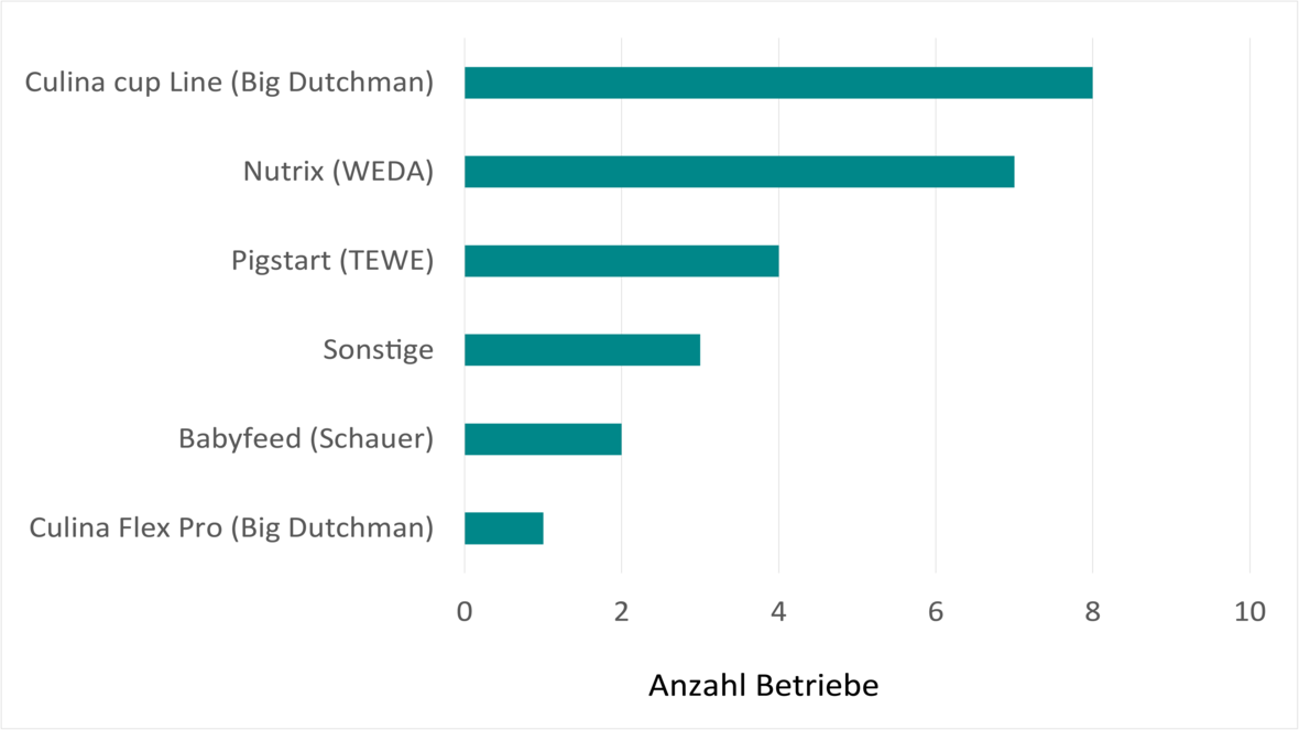 44 von 87 Teilnehmenden, die die Frage beantworteten, bieten den Ferkeln über ein Beifütterungssystem zusätzlich Ferkelmilch an. Davon gaben 18 Betriebe an, ein mobiles und 25 ein stationäres Beifütterungssystem zu nutzen. Bei der mobilen Beifütterung wird von 13 Betrieben mit der Hand gefüttert. Es sind unterschiedliche Systeme verschiedener Hersteller auf dem Markt erhältlich. Die eingesetzten stationären Beifütterungssysteme der Umfrageteilnehmenden sind Abb. 3 zu entnehmen.